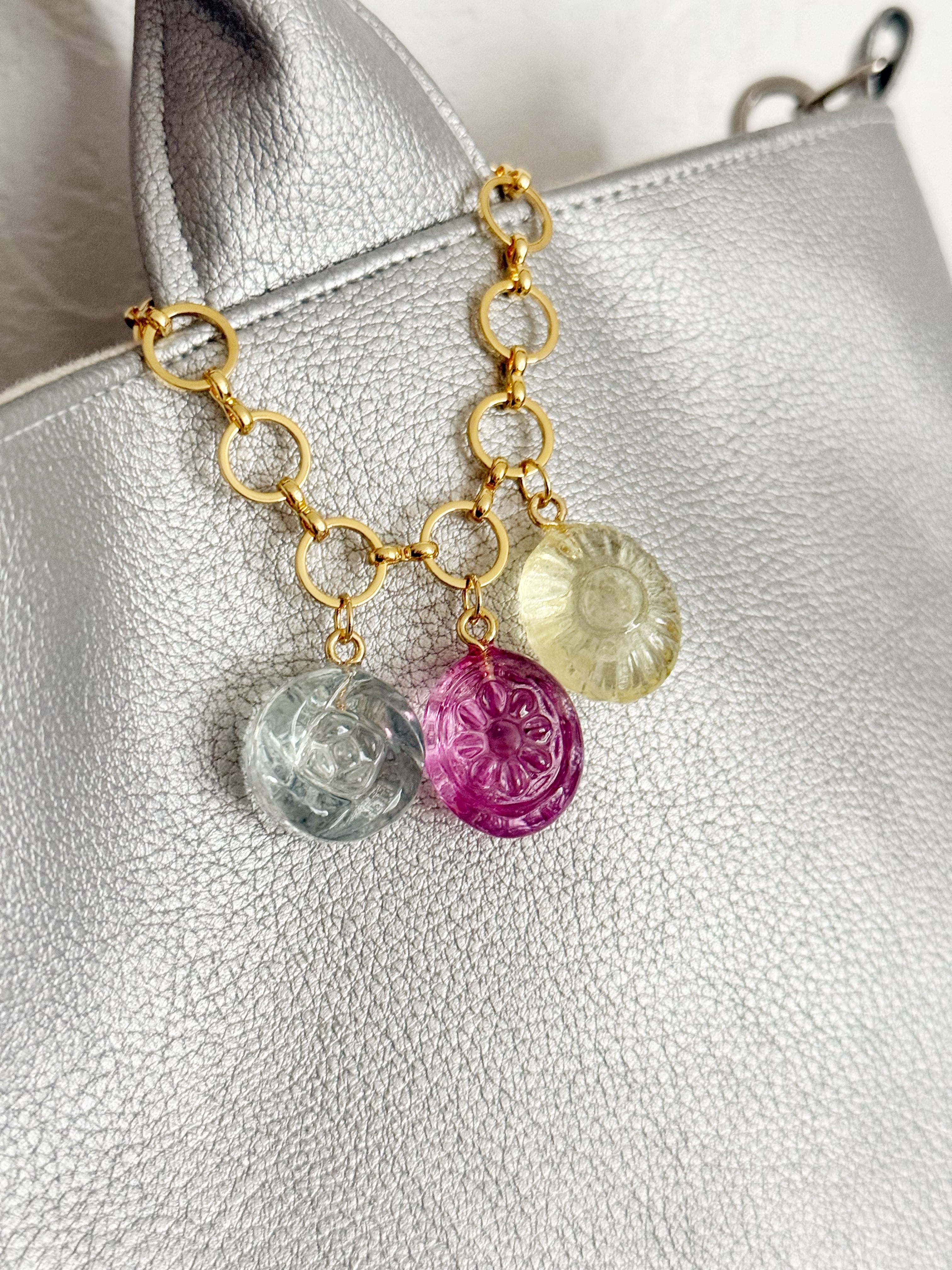キーホルダーまたはバッグチャームからお選びいただけます。オプションからお選びください。選択しないとオーダーできないようになっておりますのでご注意ください。どちらを選んでも追加料金はありません。(参考写真は5粒、7粒のものを使用しておりますがこちらの作品はドロップ3粒です)