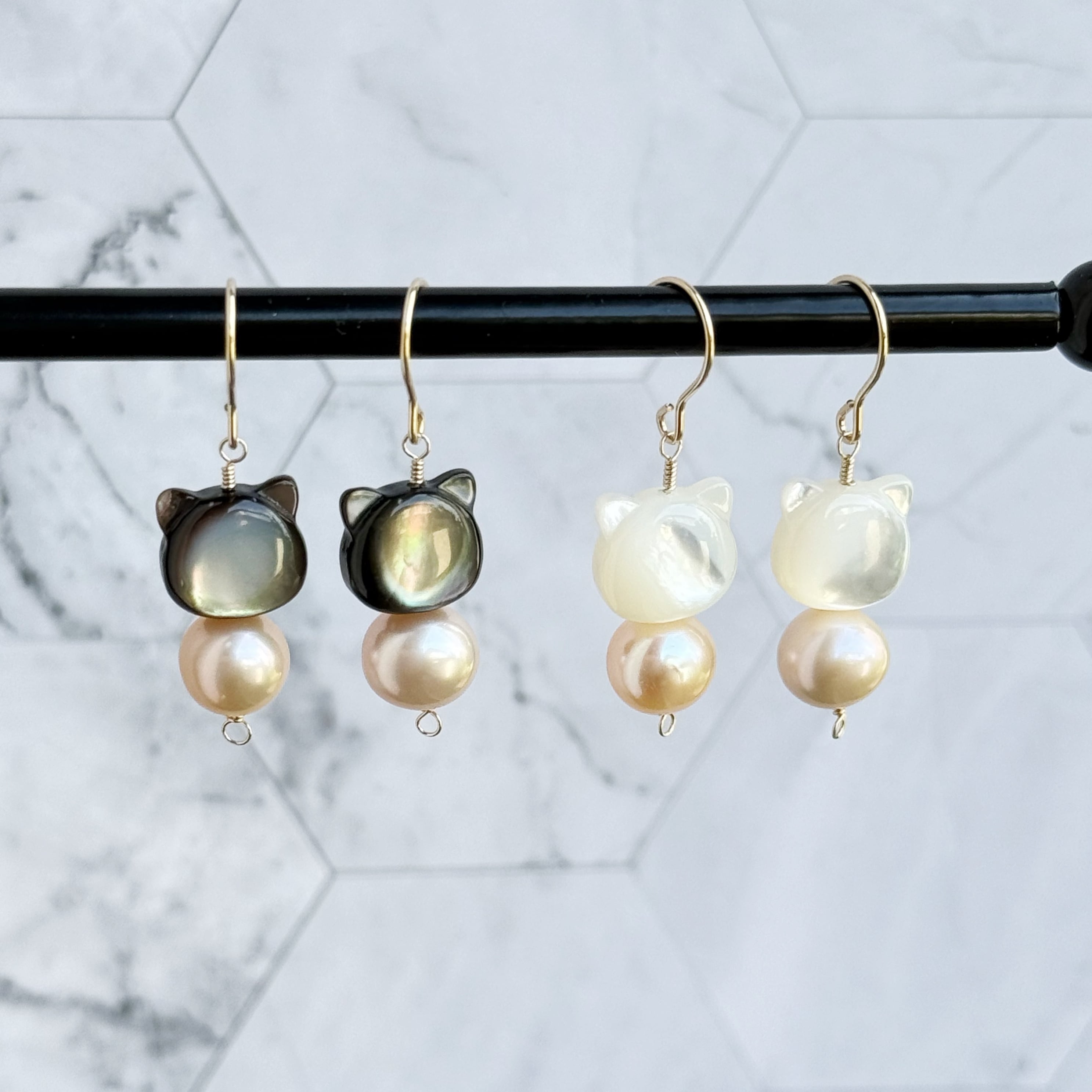 つややかな猫シルエットの天然シェルと、やさしい輝きの淡水パールを組み合わせた、大人可愛いピアス/イヤリングです。