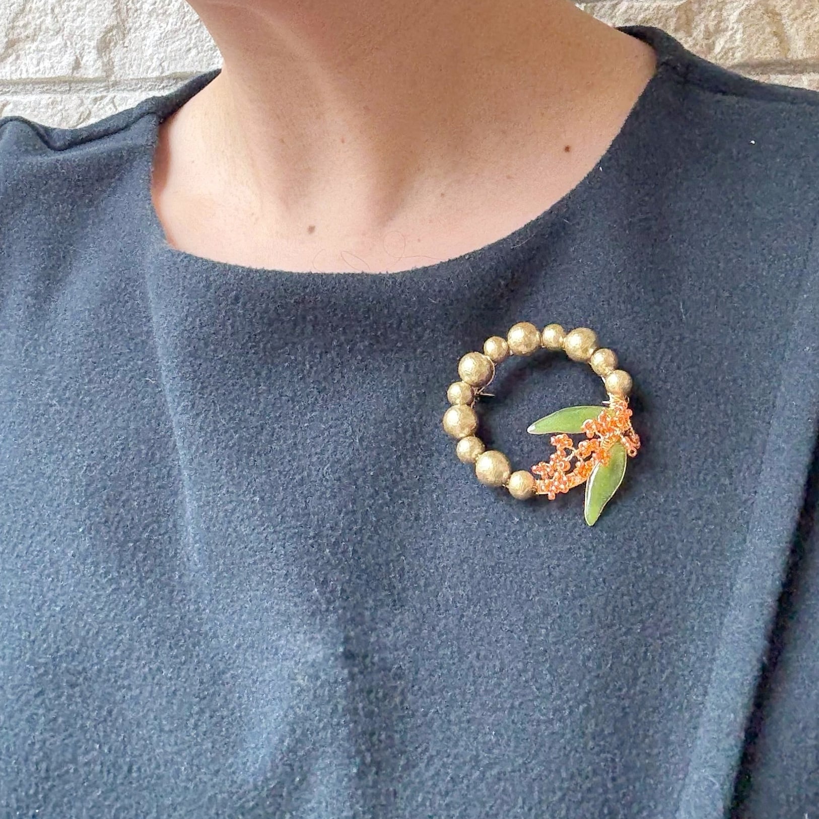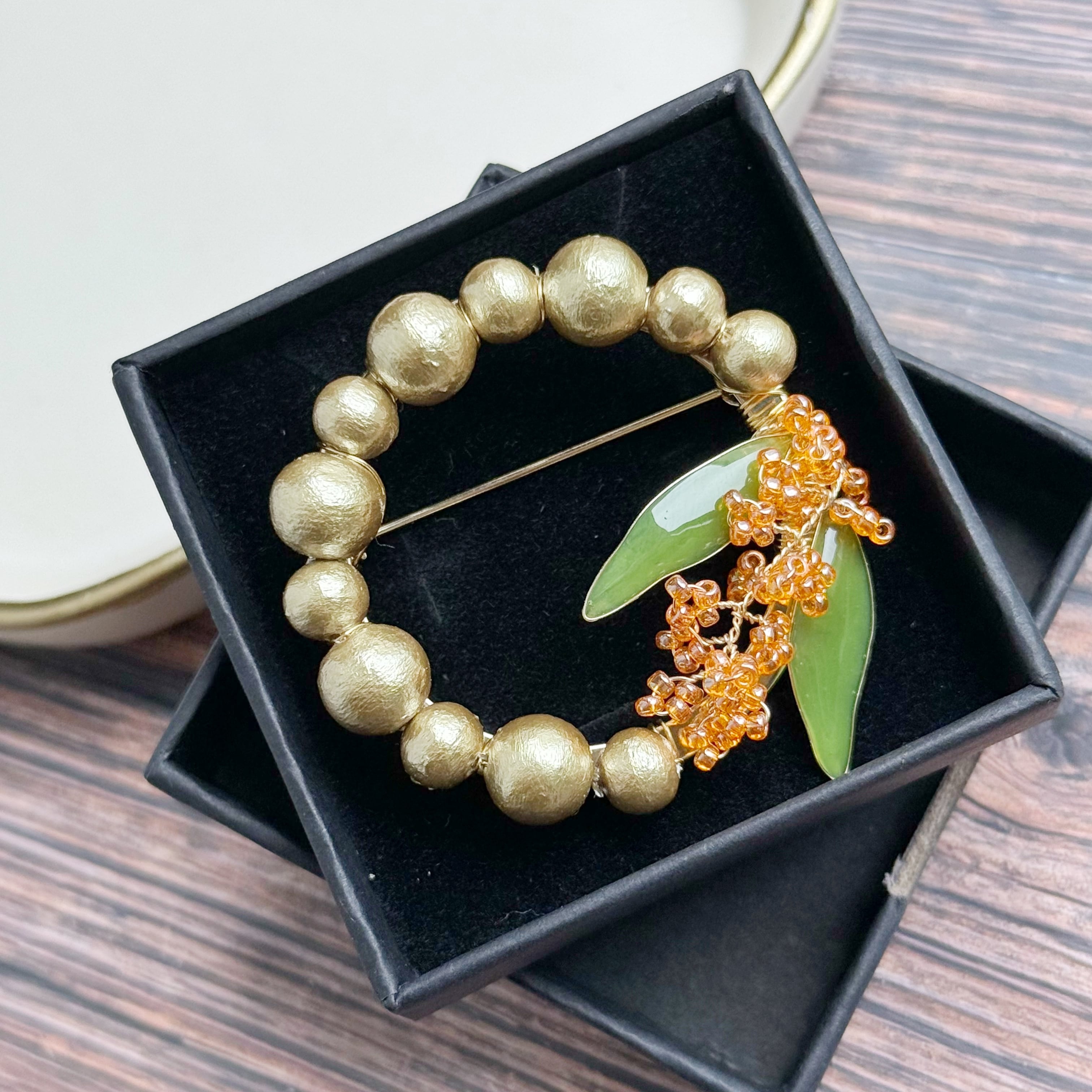 【早割】秋を先取り 金木犀とコットンパールのブローチ 還暦祝い 敬老の日にも キンモクセイ