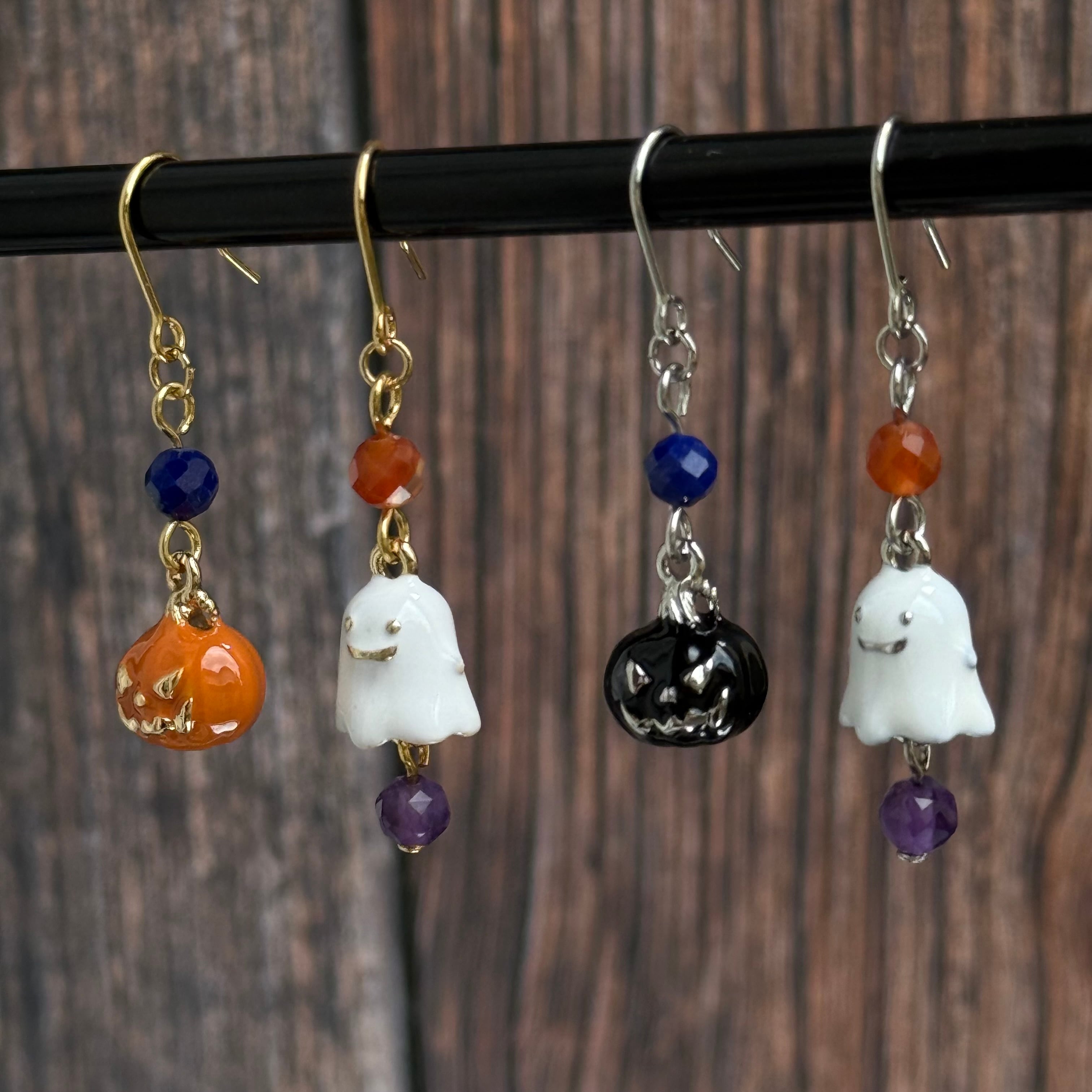 魔女の小さな落とし物—ジャックオランタンとおばけのピアス イヤリング イヤーカフ 3種の天然石