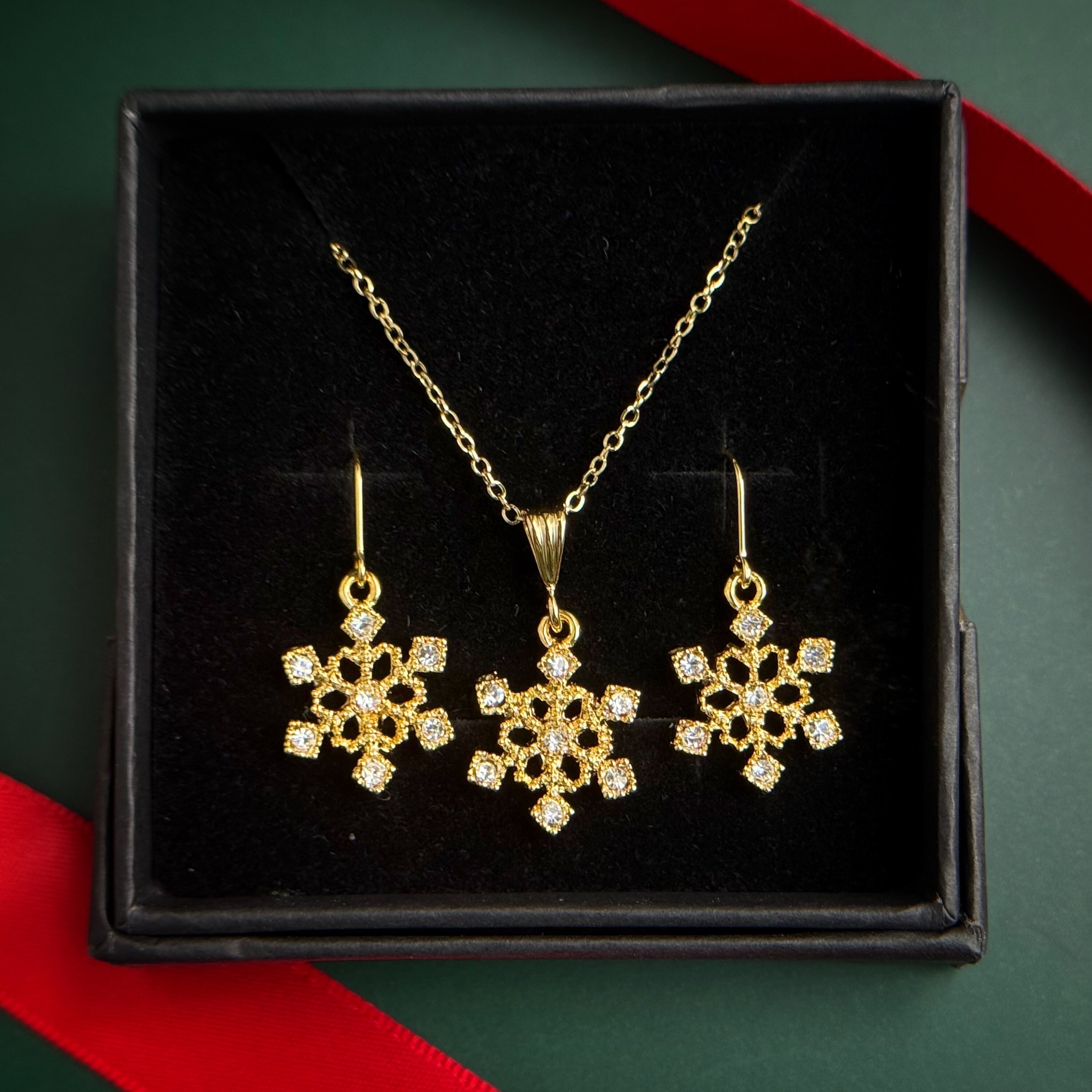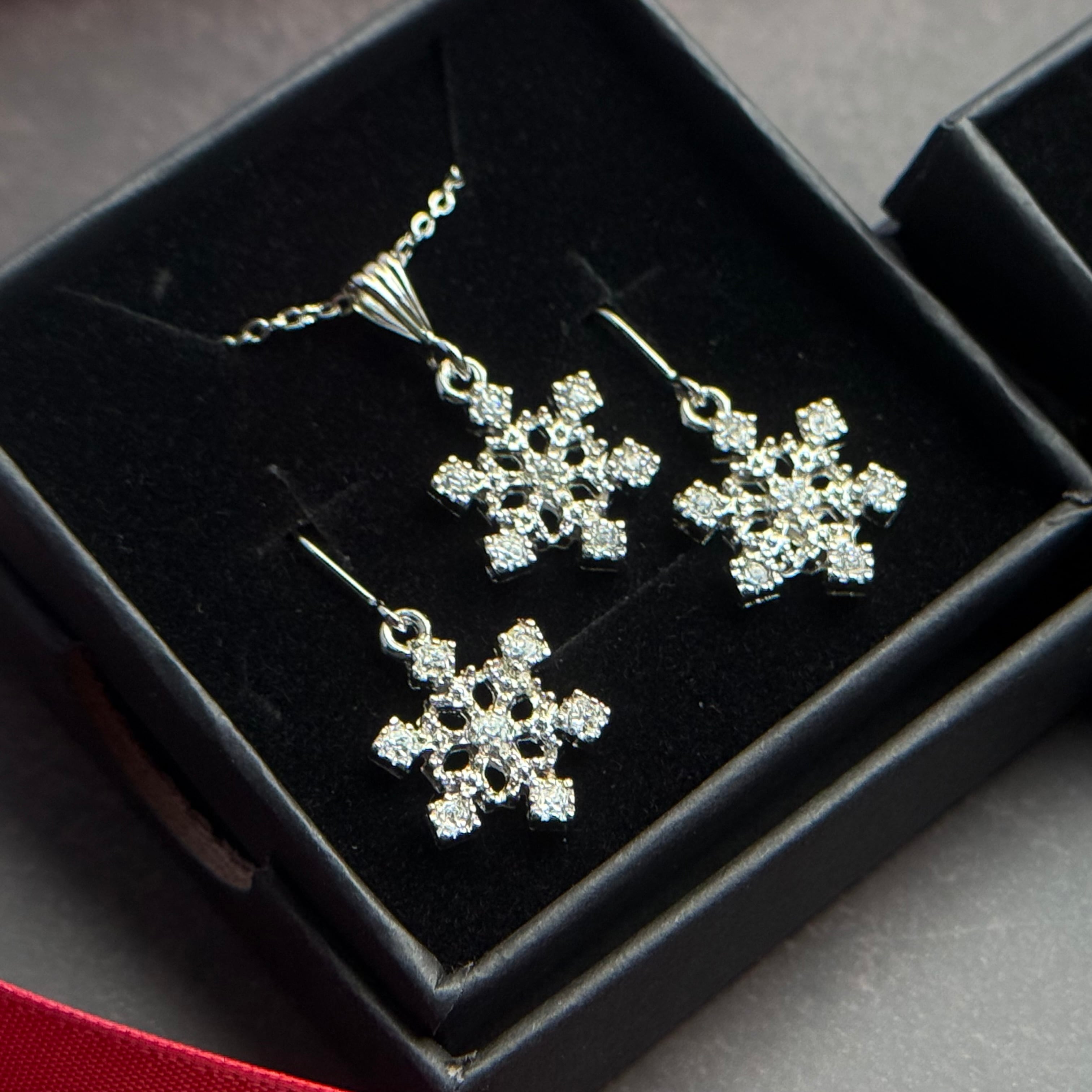 クリスマスや冬のギフトにぴったりの、雪の結晶モチーフのピアス(またはイヤリング、イヤーカフ)とネックレスのセットです。