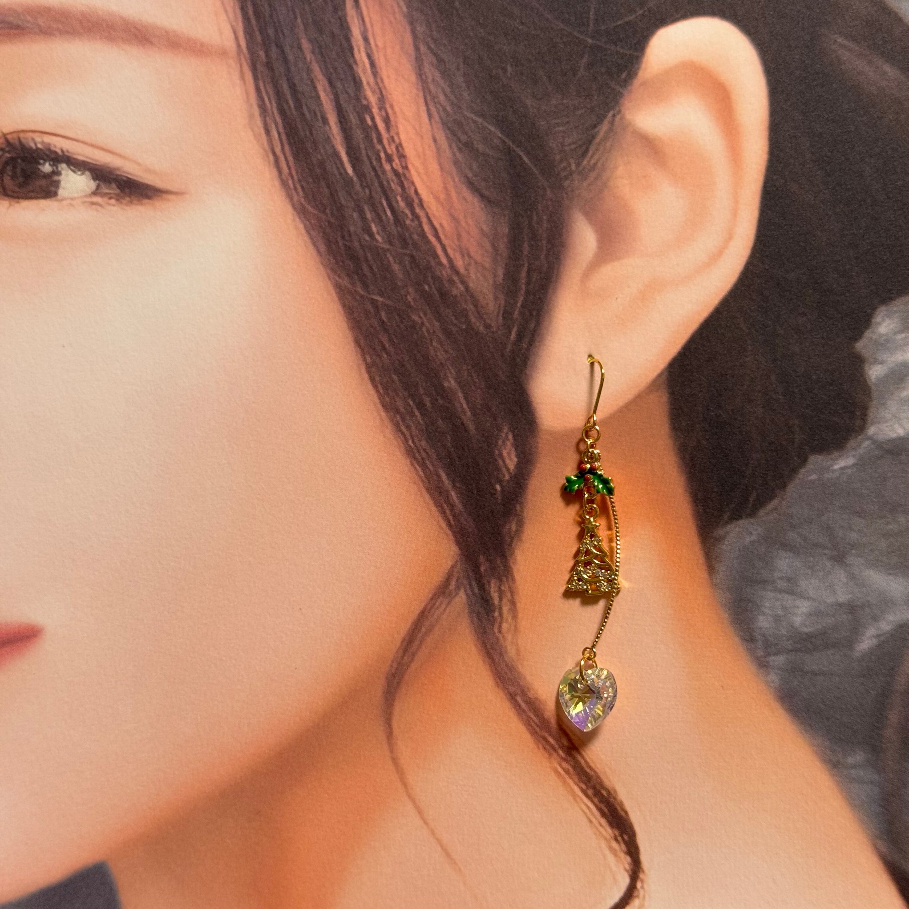 -Heart Lights- クリスマスツリーとクリスタルハートのピアス イヤリング イヤーカフ
