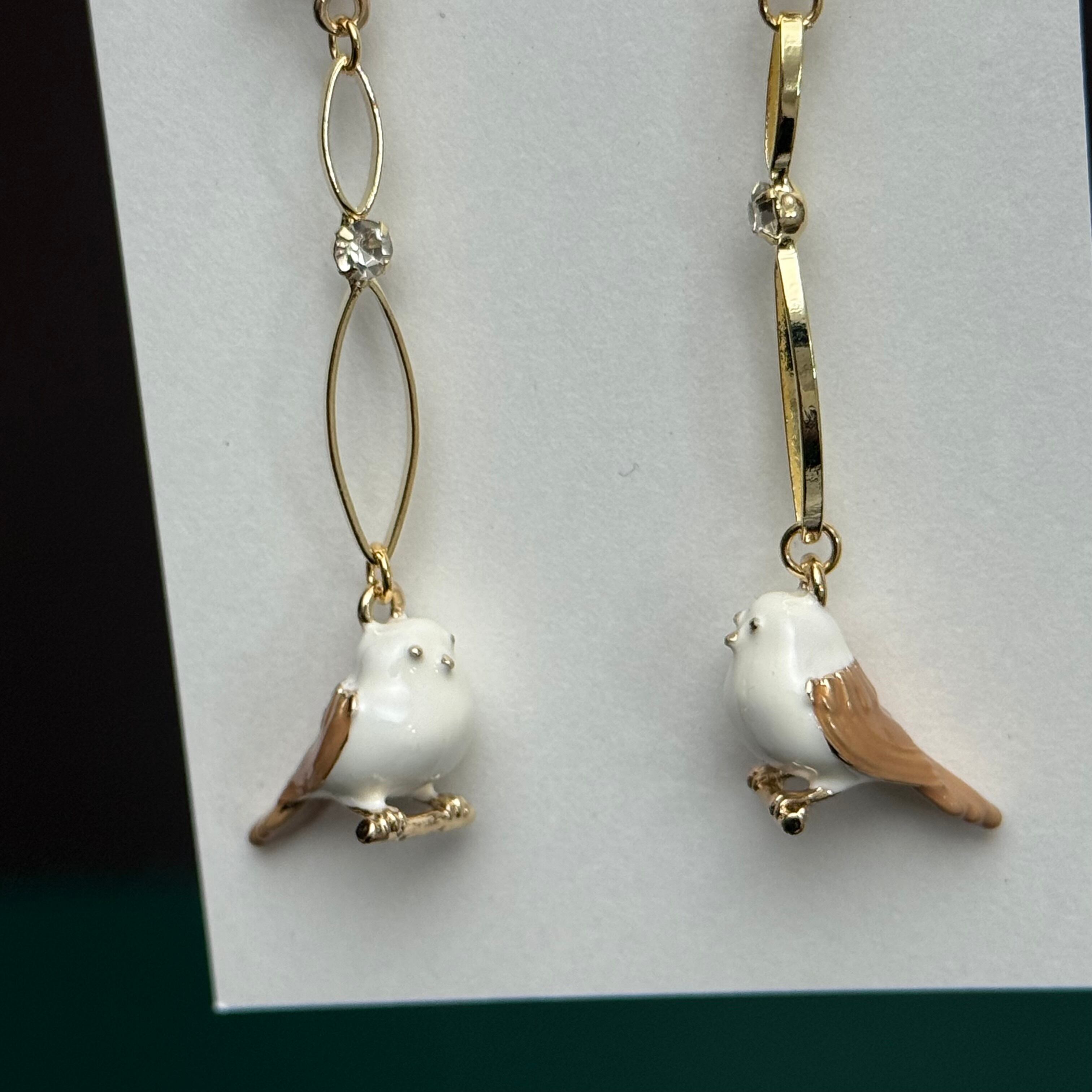 クリスタルのように光を反射するスノーフレークと、ころんとした丸いフォルムのシマエナガたち。淡いゴールドのフレームと繊細なカーブラインが、やさしく耳元に寄り添います。