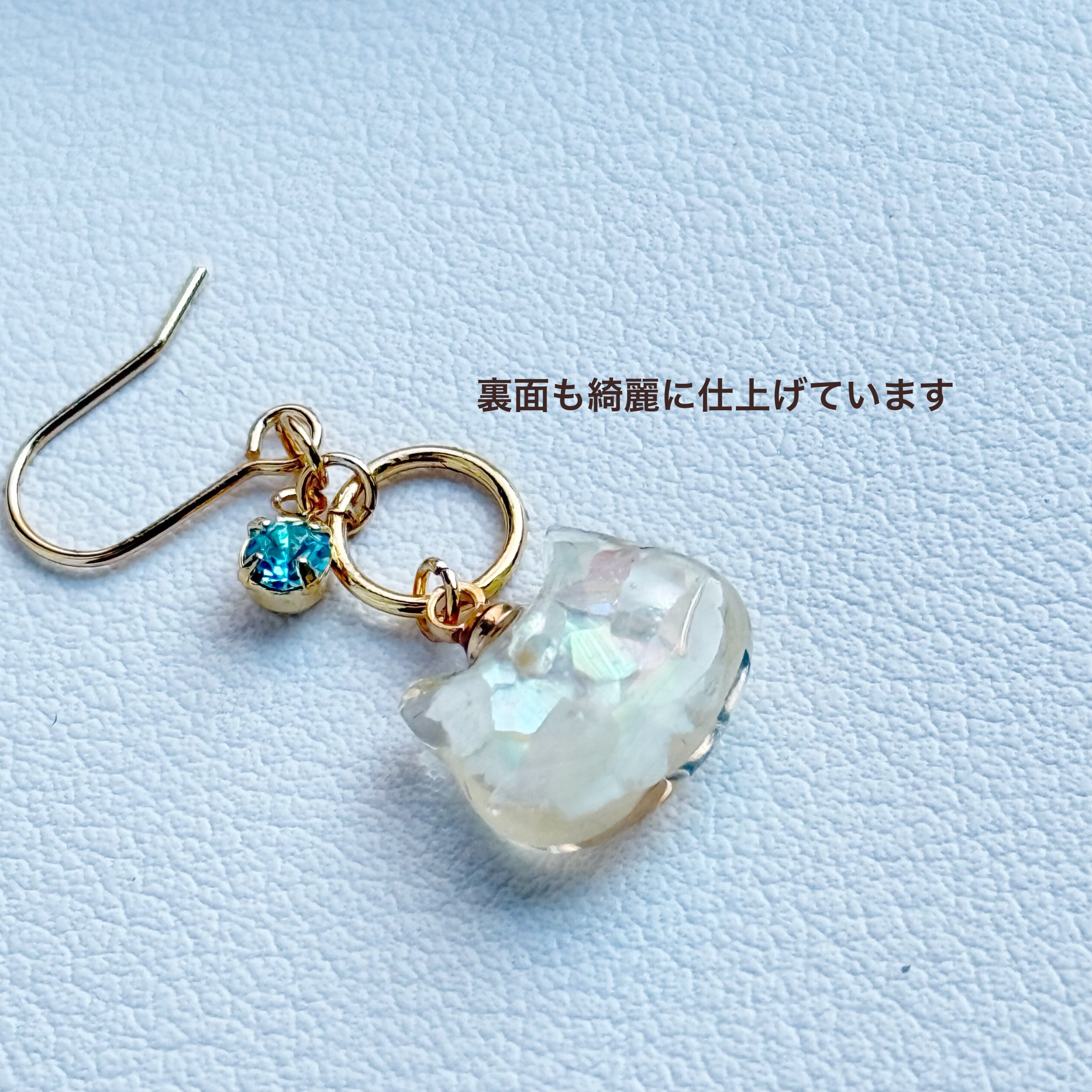 白いシェルとレジンを使った小さな猫ちゃんパーツを作って、耳飾りに仕上げました。オーロラに偏光するホワイトシェルは角度によって幻想的に輝きます。