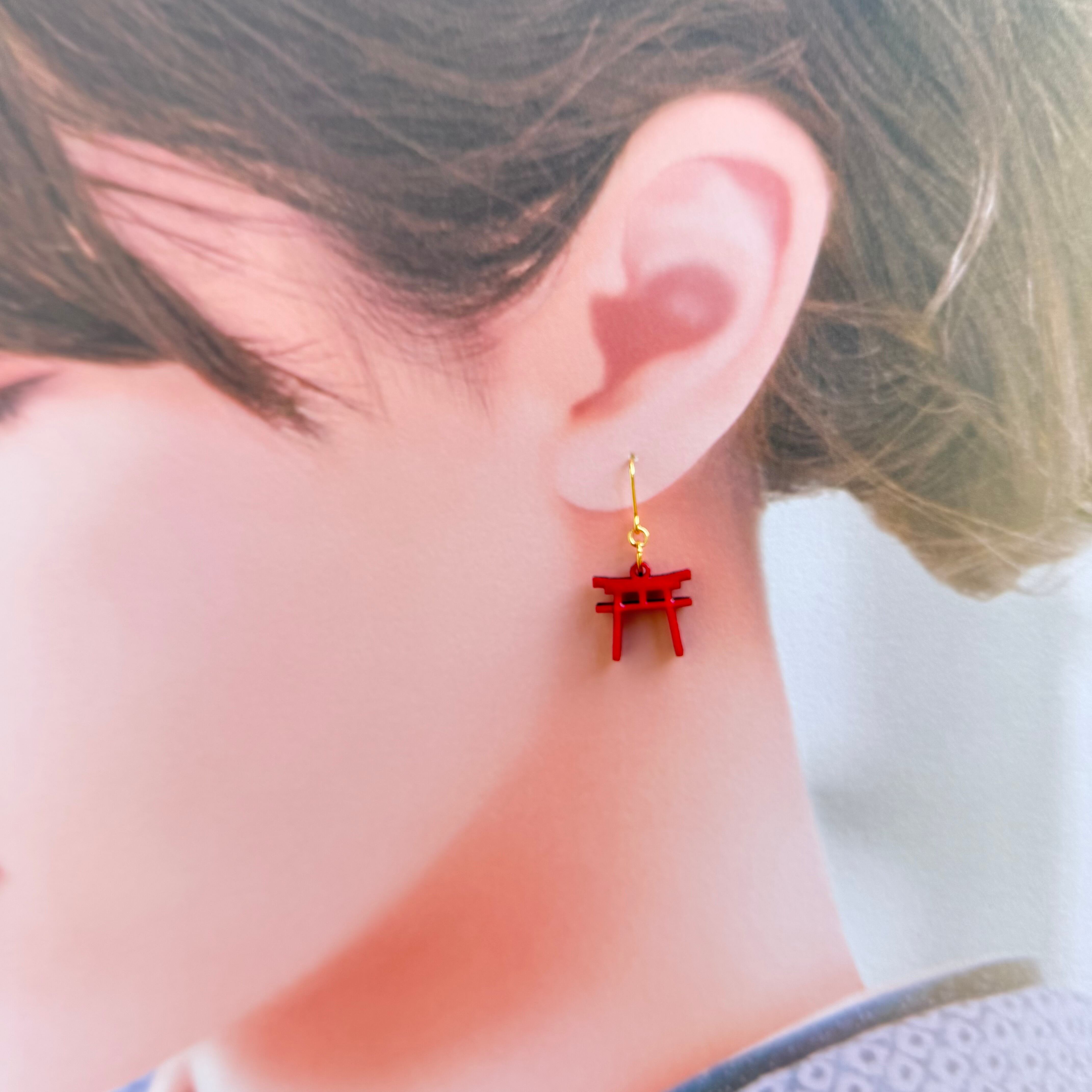 神社の参道にそっと佇む、小さな朱色の鳥居をモチーフにしたピアスです。