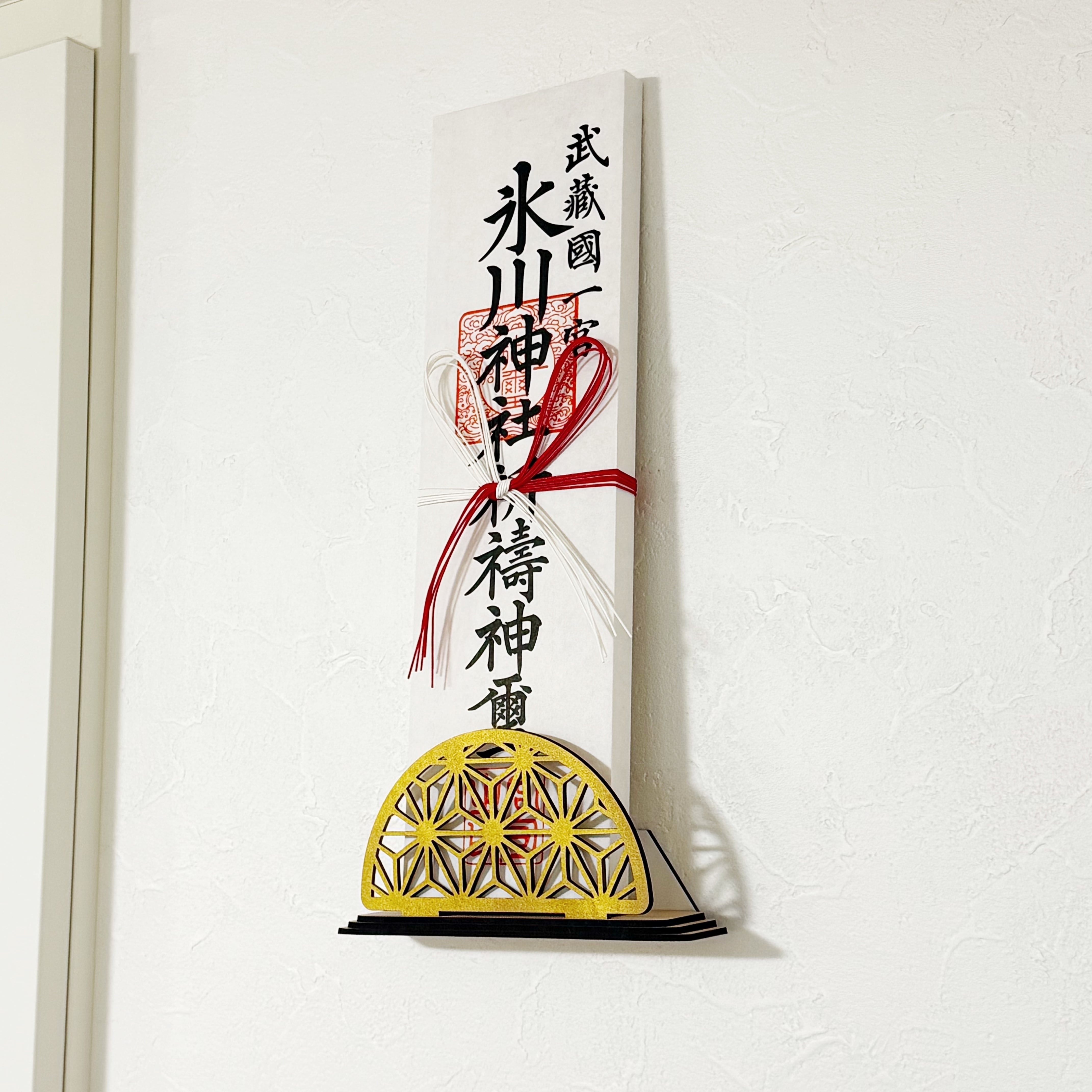 背板を壁紙と同じ「マットホワイト(つや消し白)」に仕上げることで、壁に飾った時に板の存在感が消え、まるでゴールドの麻の葉飾りとお札だけが宙に浮いているような、不思議で美しい見た目になります。