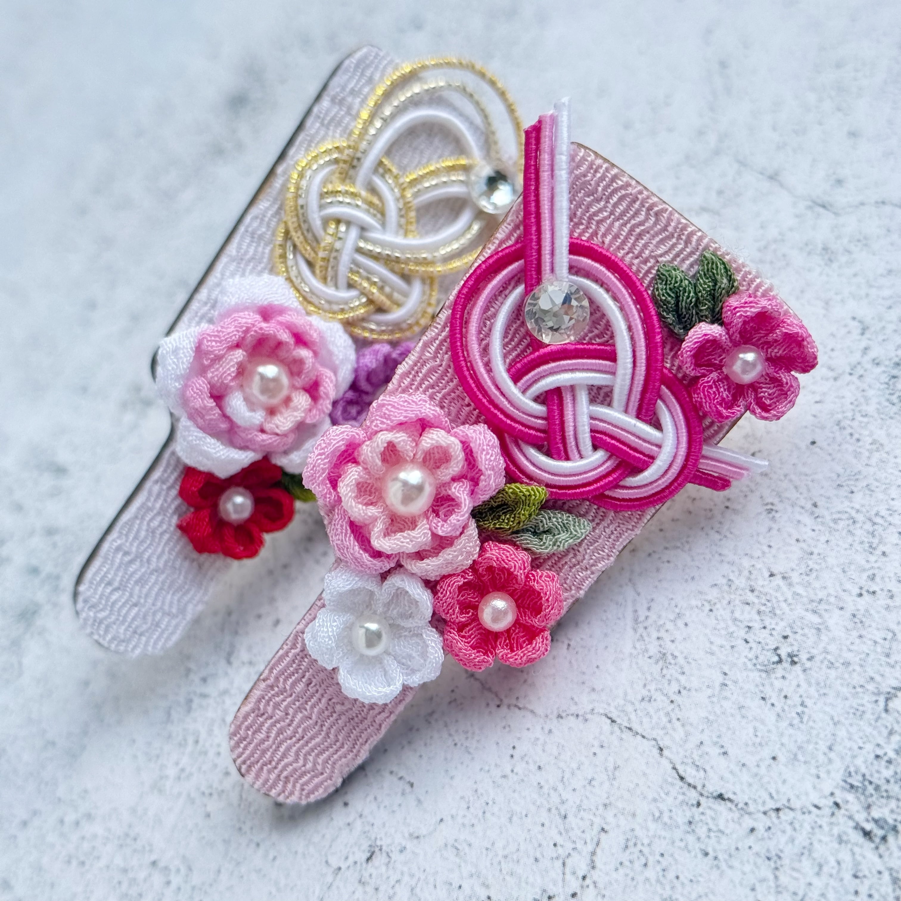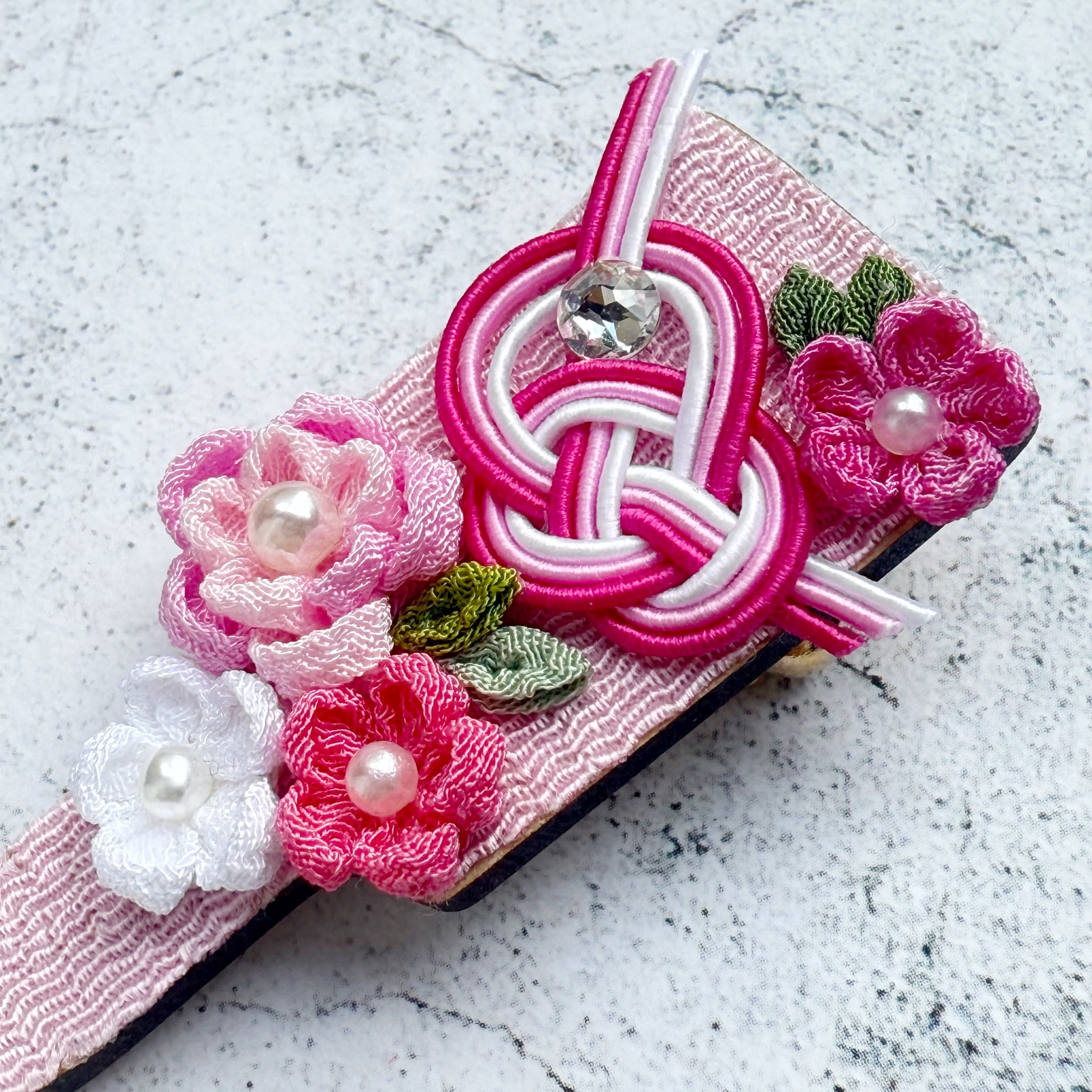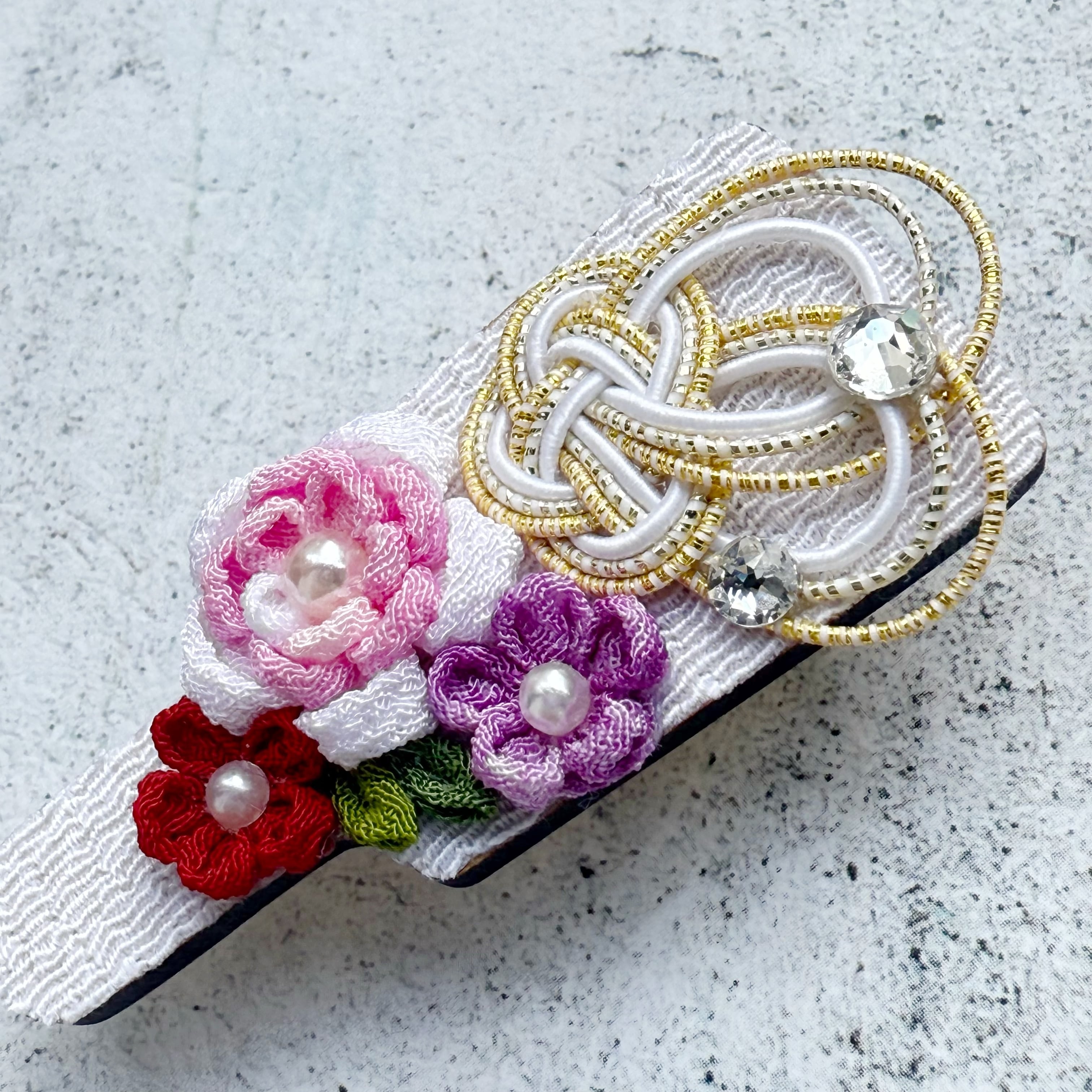 中心にはキラリと光るストーンやパールを添え、伝統的な和の雰囲気の中にも、現代的な可愛らしさをプラスしています。