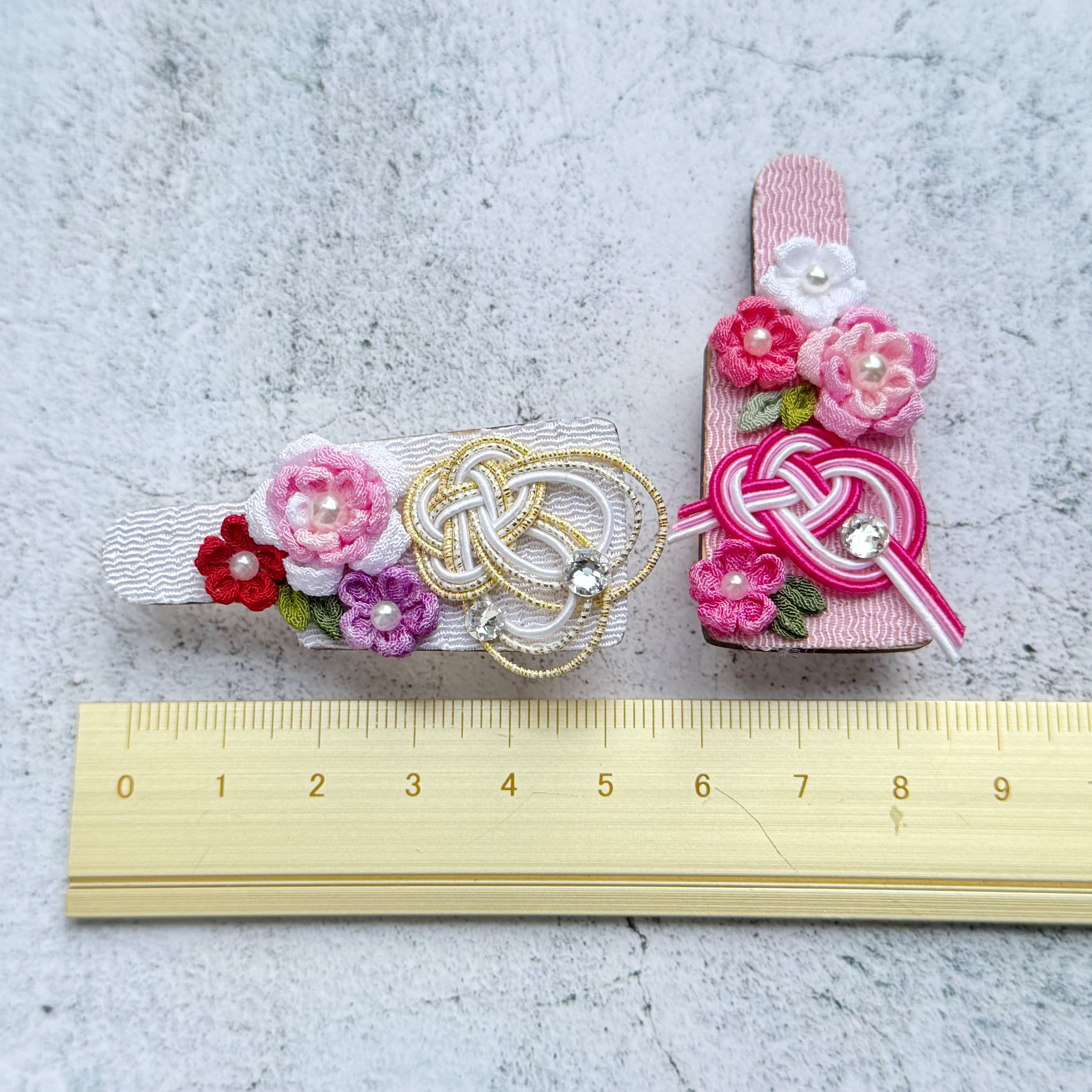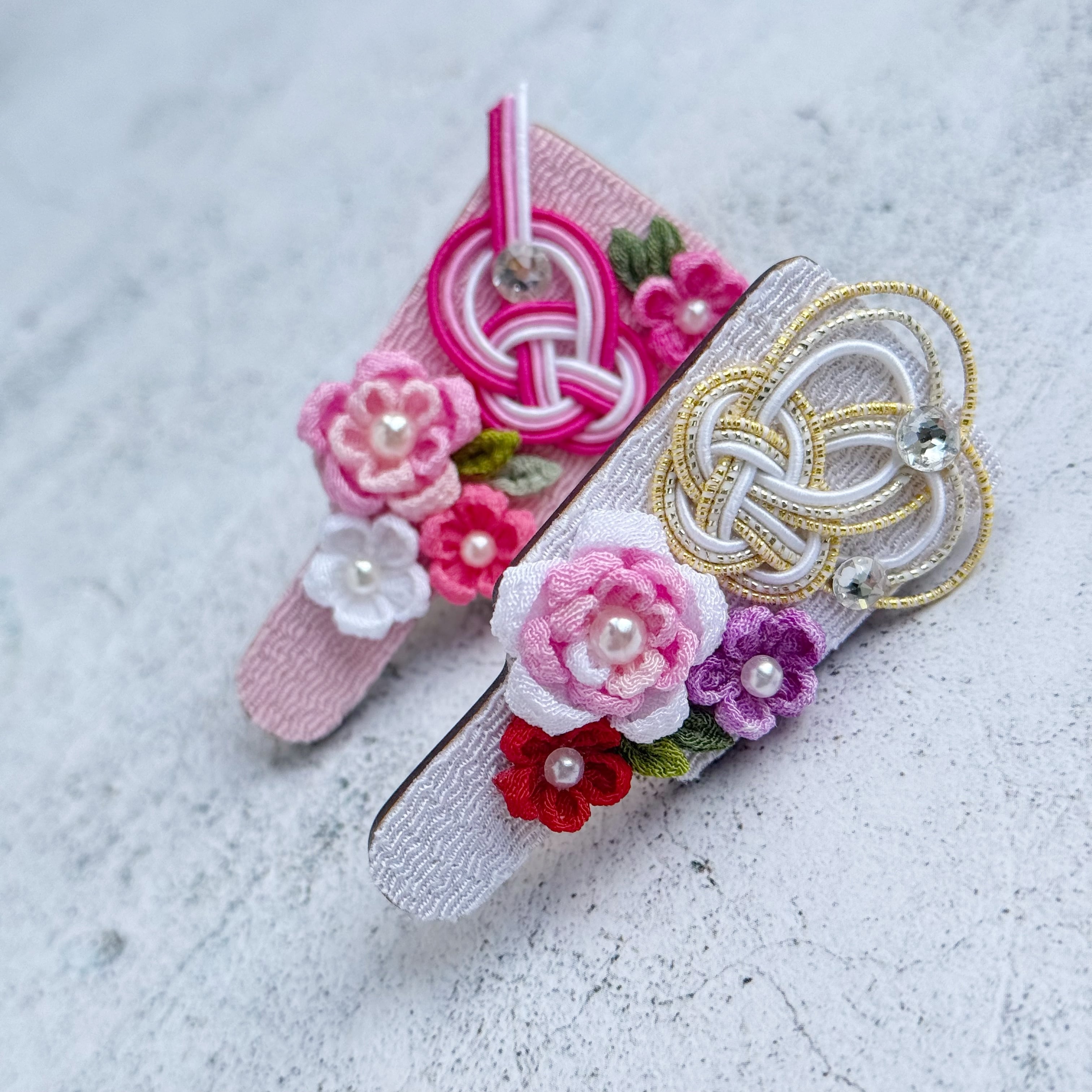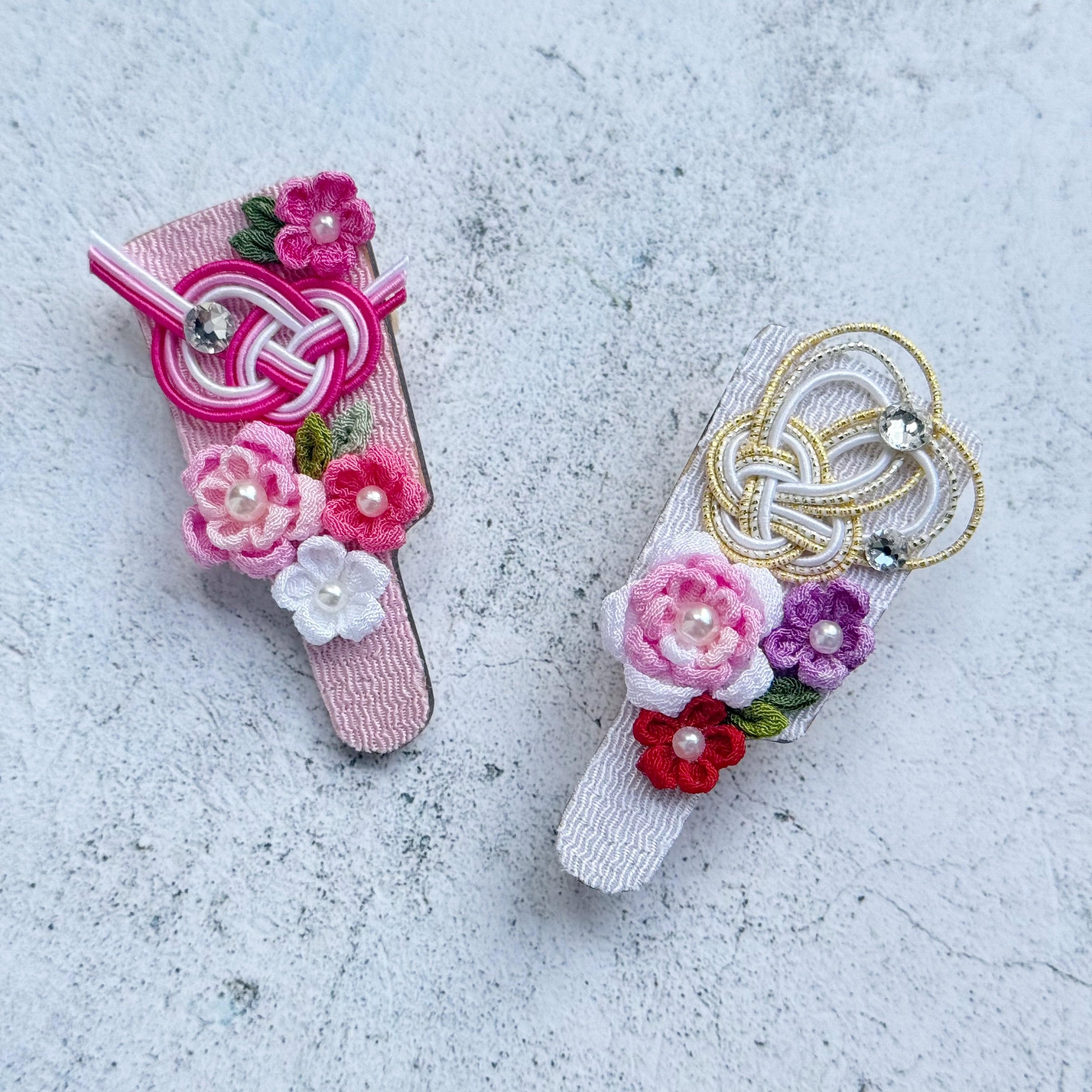 中心にはキラリと光るストーンやパールを添え、伝統的な和の雰囲気の中にも、現代的な可愛らしさをプラスしています。