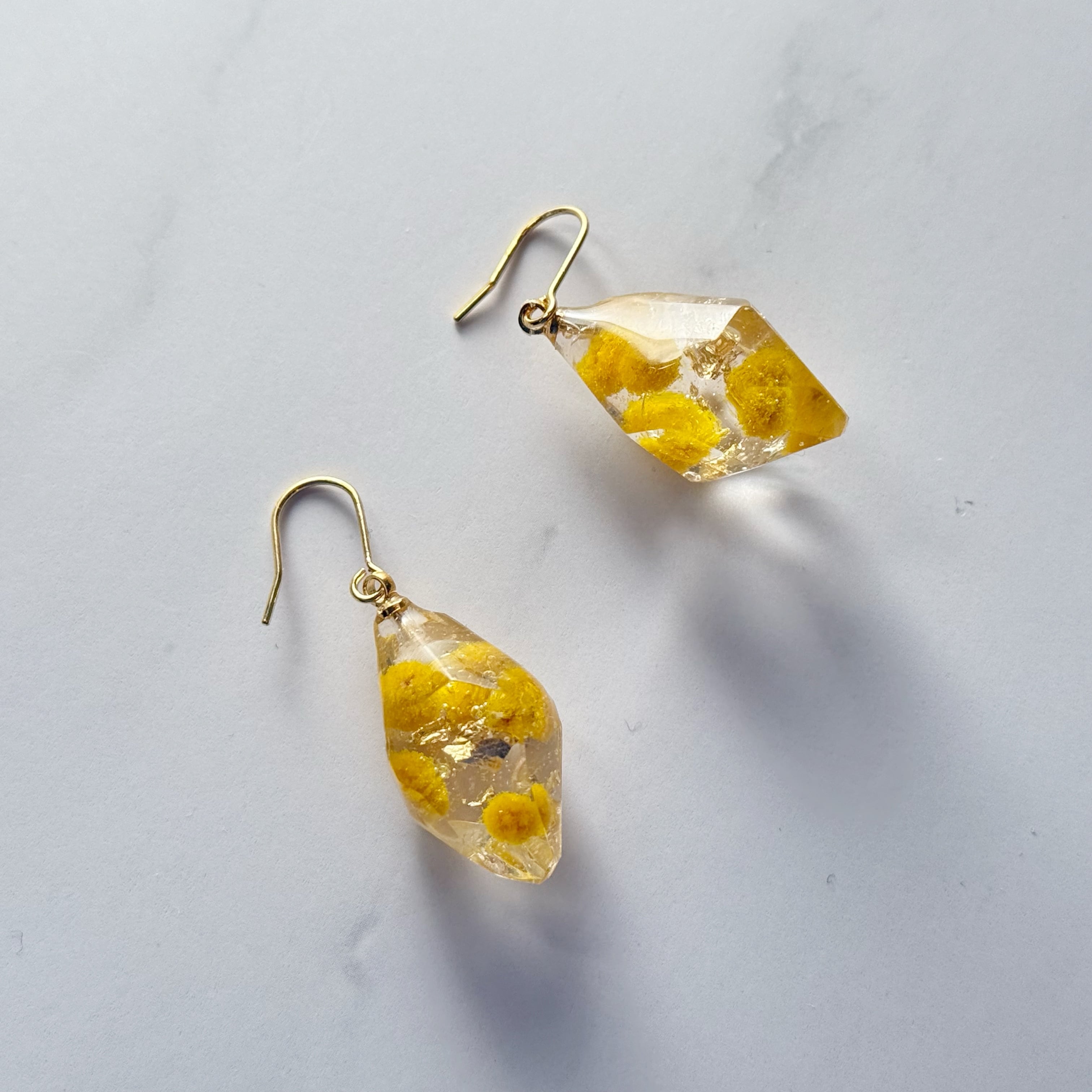 透明度の高いレジン鉱石に、ミモザのふわふわとした花弁と、春の日差しに見立てたゴールドホイルを閉じ込めました。