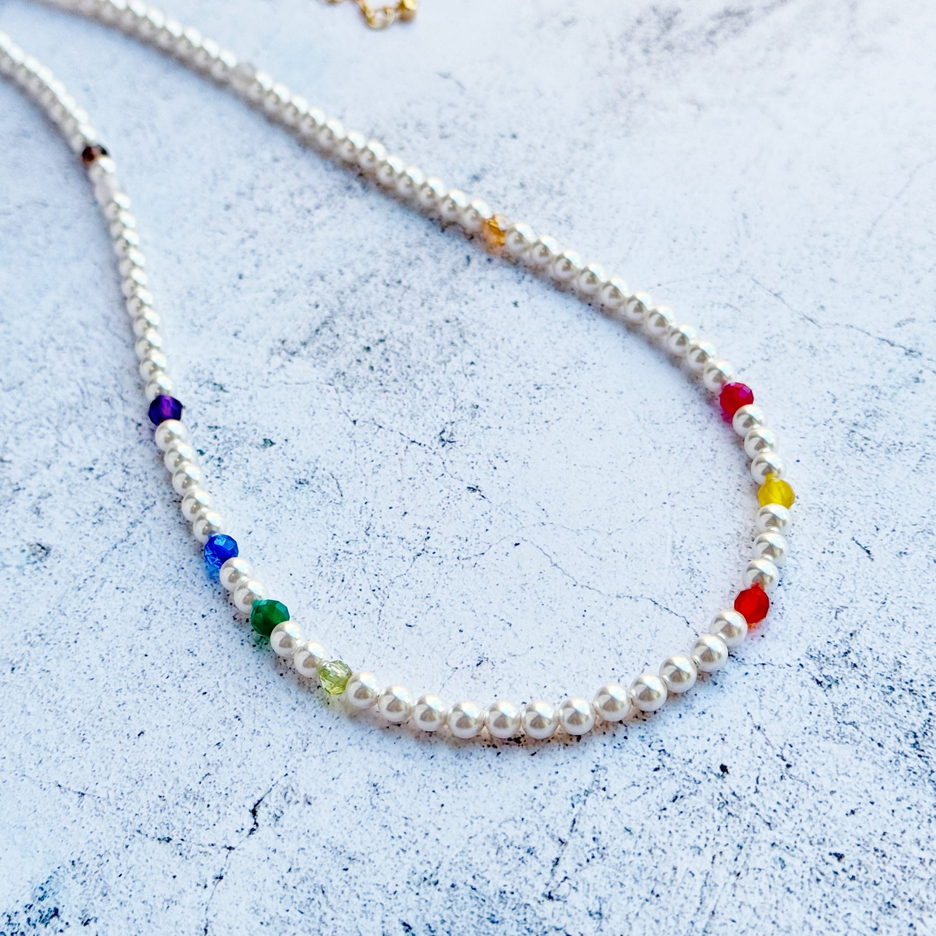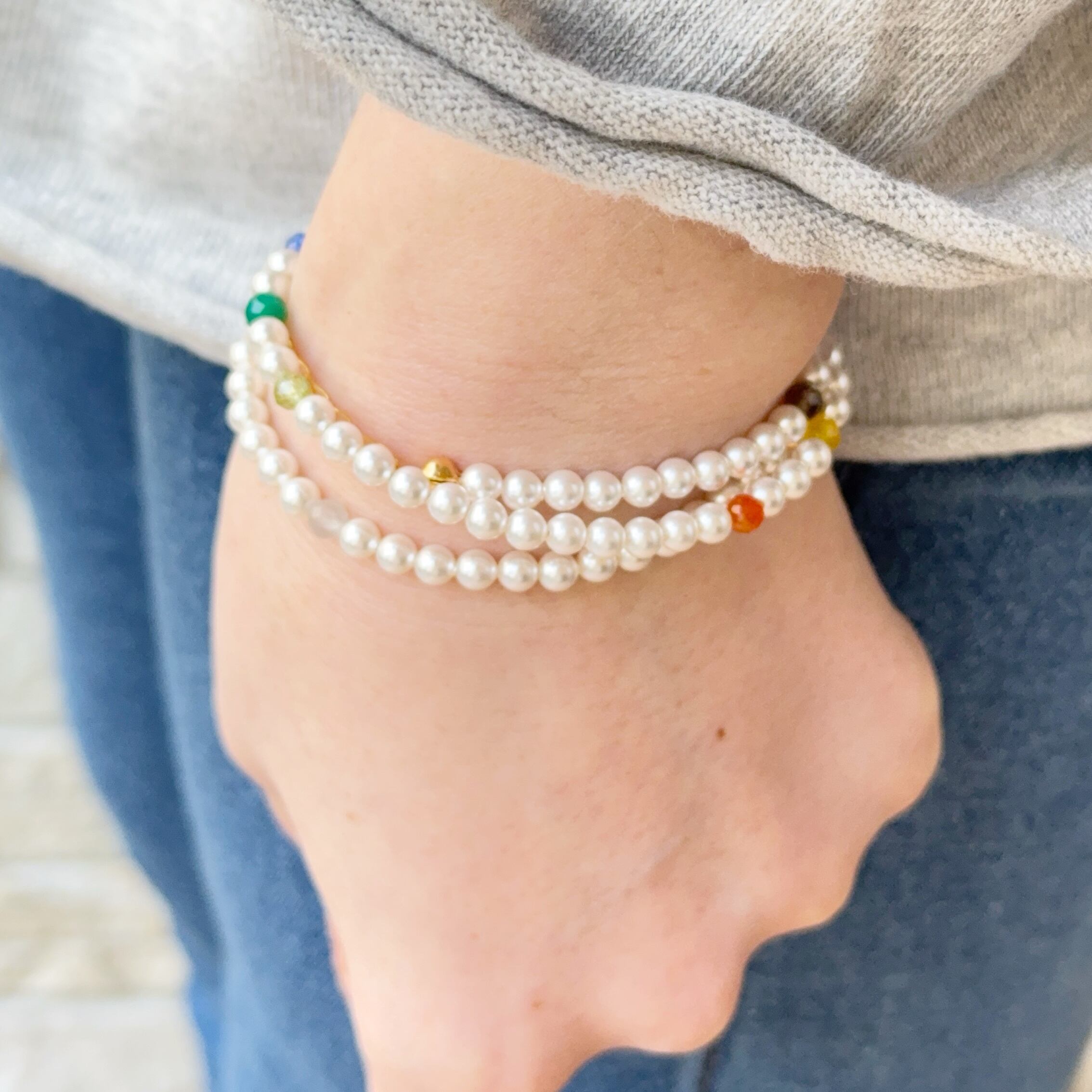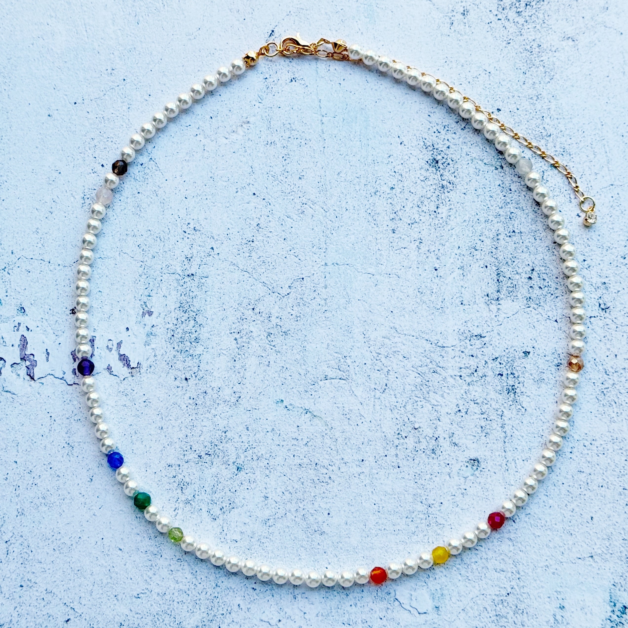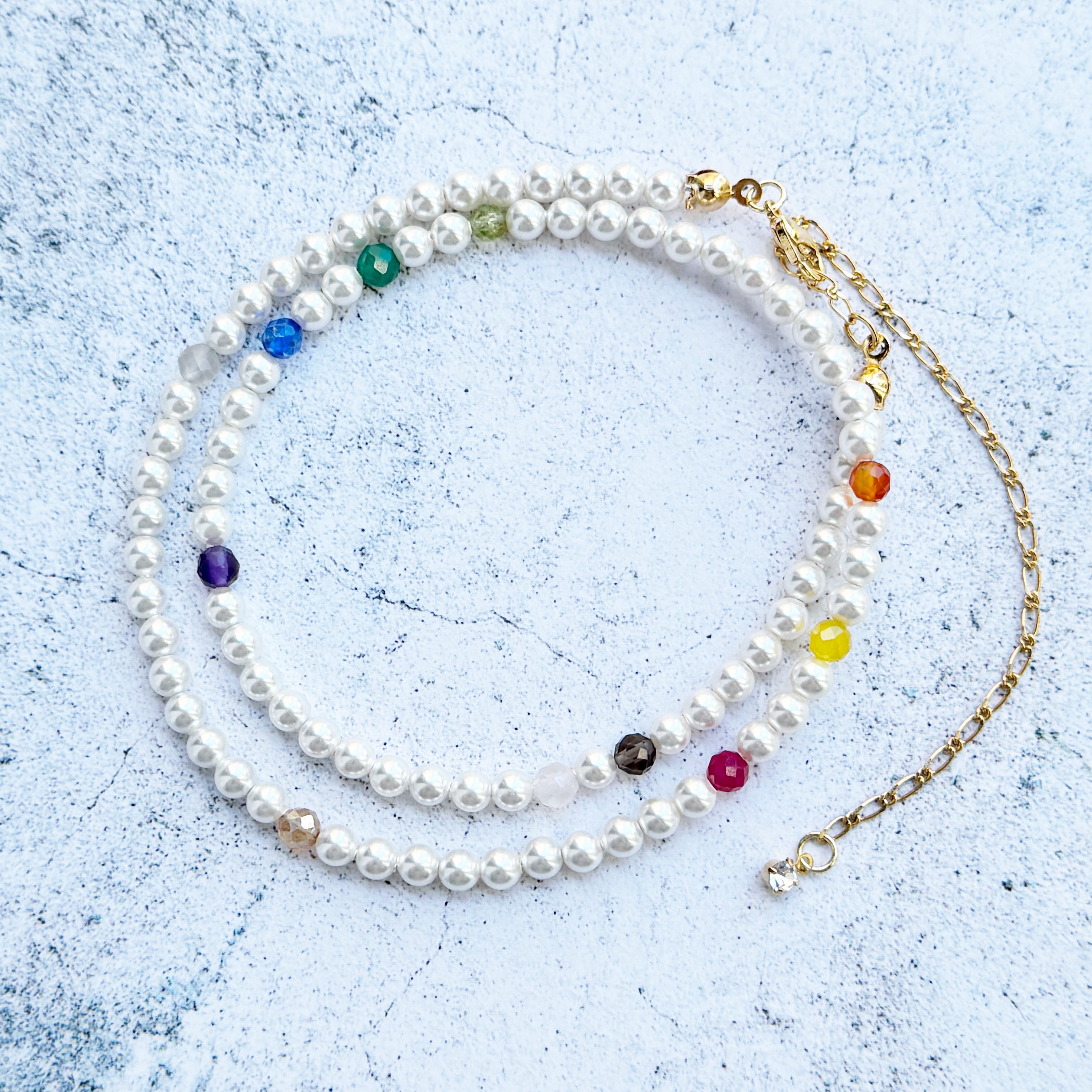 • 素材: クリスタルパール、ナイロンコートワイヤー、マルチカラー天然石、K16GP(16金ゴールドコーティング)または本ロジウムコーティングパーツ、4mmクリスタルパール、4mm天然石(スモーキークォーツ、アメジスト、ペリドット、合成サファイア、合成ルビー、グリーンオニキス、オレンジクォーツ、イエロークォーツ、シャンパンカラークォーツ、ローズクォーツ、ペリドット※やや小さめ)