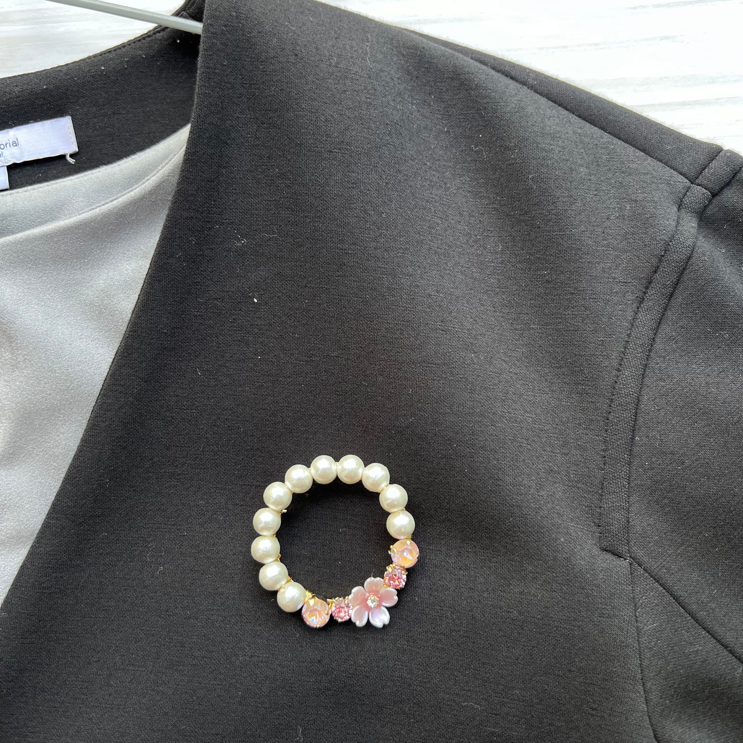 華やか大きめ コットンパールと桜のサークルブローチ コサージュ ガラスストーンを添えて