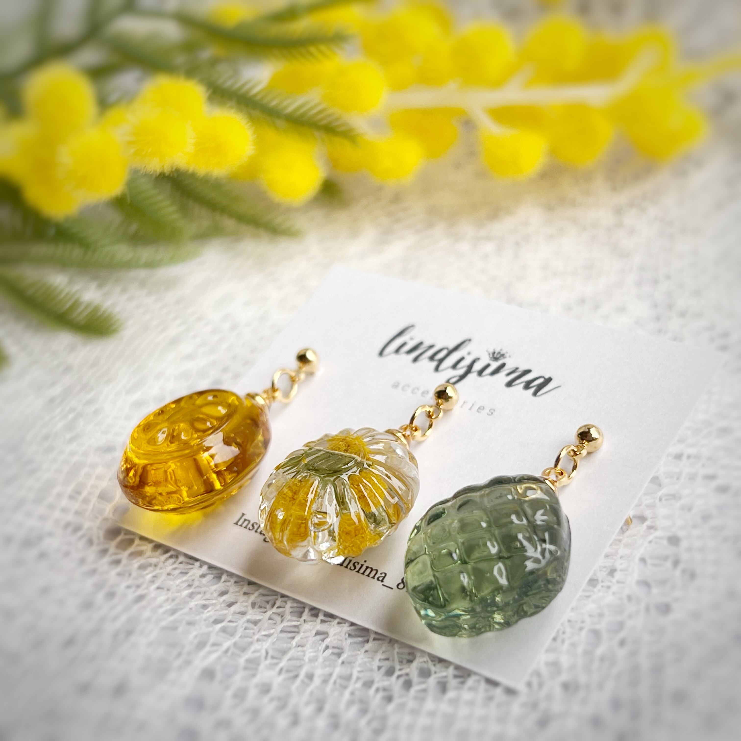 本物のお花を使ったフラワードロップ3粒ピアス・イヤリング・イヤーカフ ミモザ チャーム変更可能