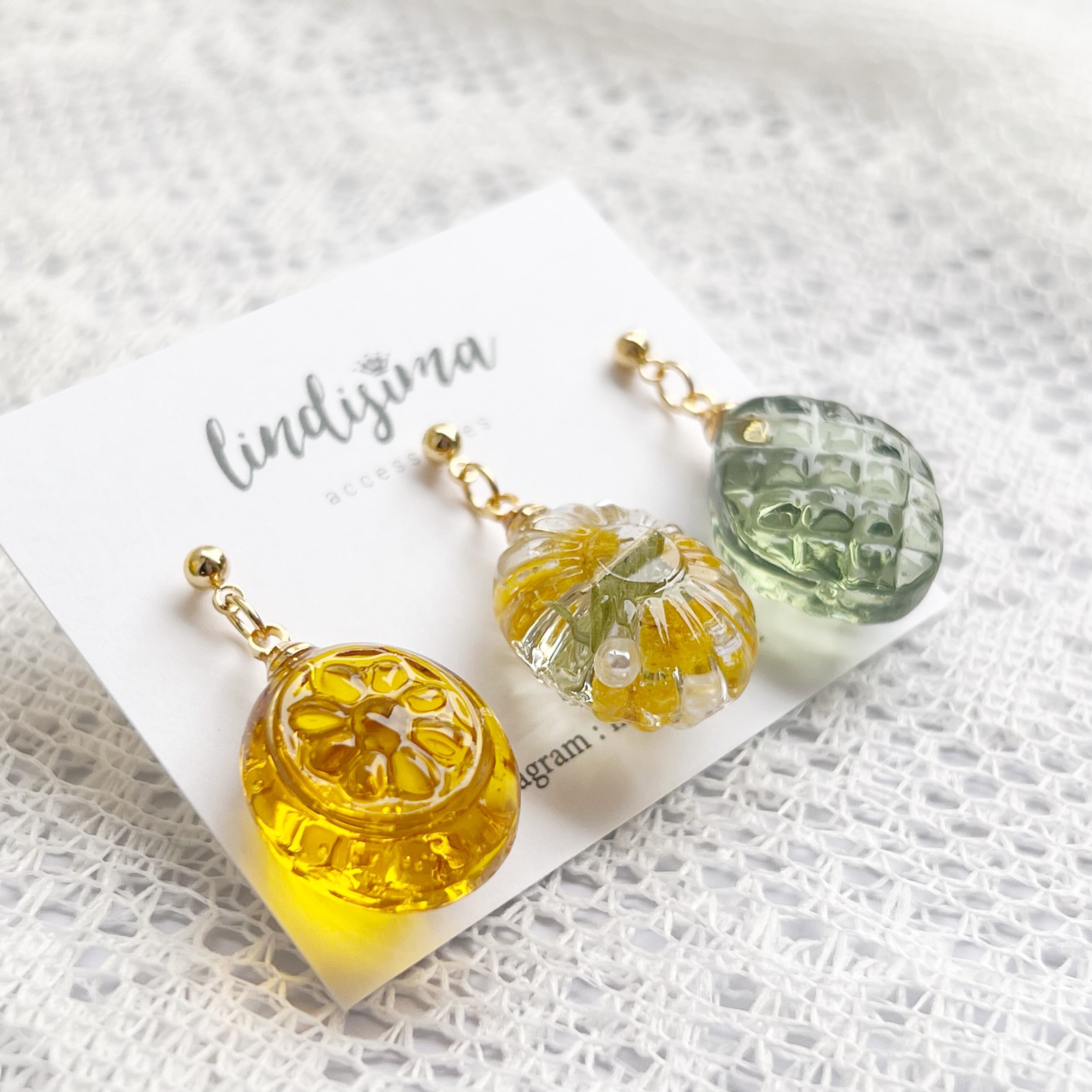 ※ドロップはレジンで作成しております。気泡などもありますのでご了承ください。また、色の調合はその都度しておりますので、多少の個体差はご容赦くださいませ。