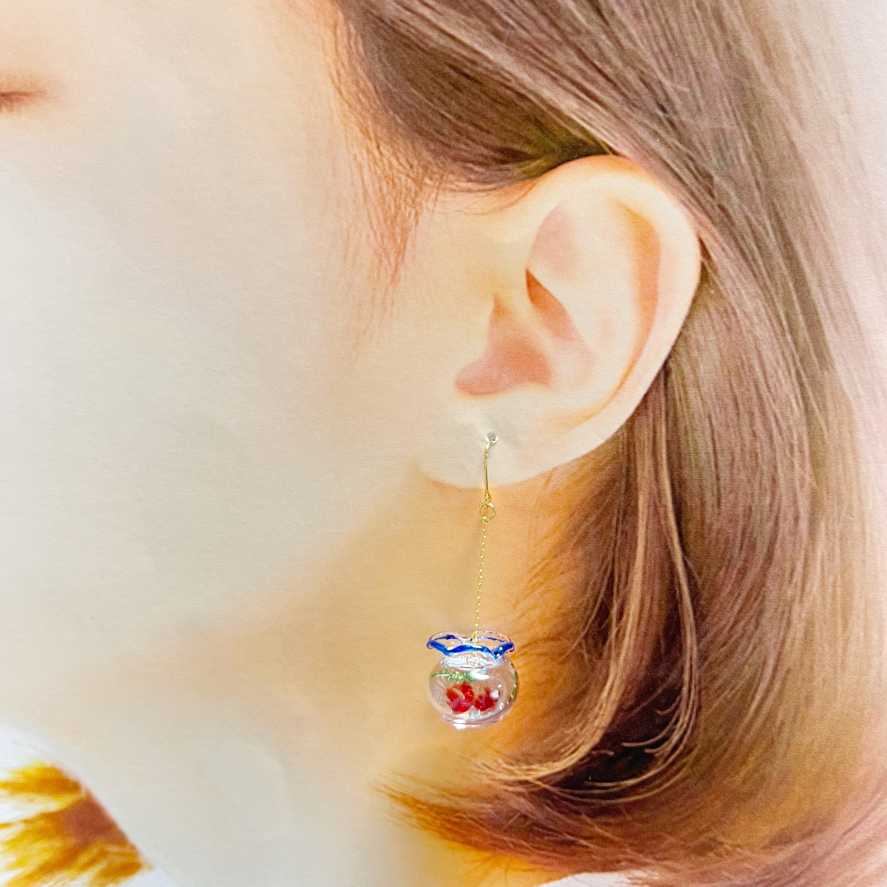 【片耳販売】日本の夏を感じる金魚鉢のミニチュアピアス イヤリング
