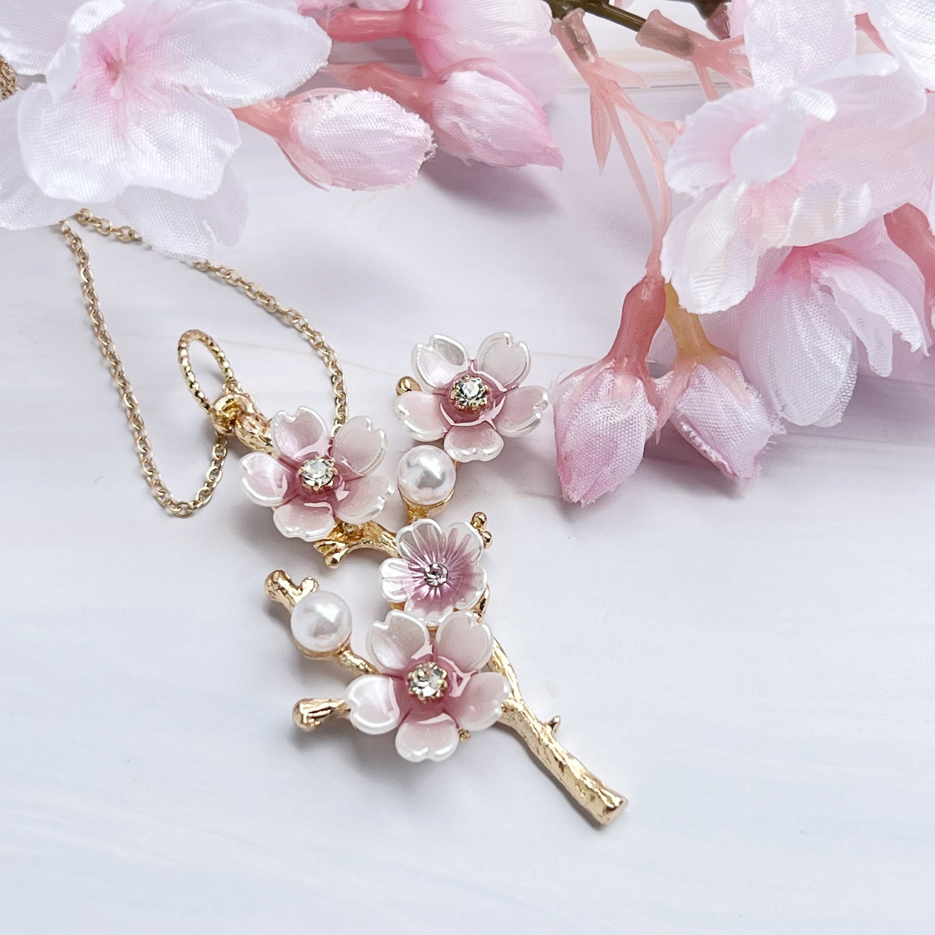 桜をイメージしたお花のパーツとパールを組み合わせて作った、桜の枝モチーフネックレスです。