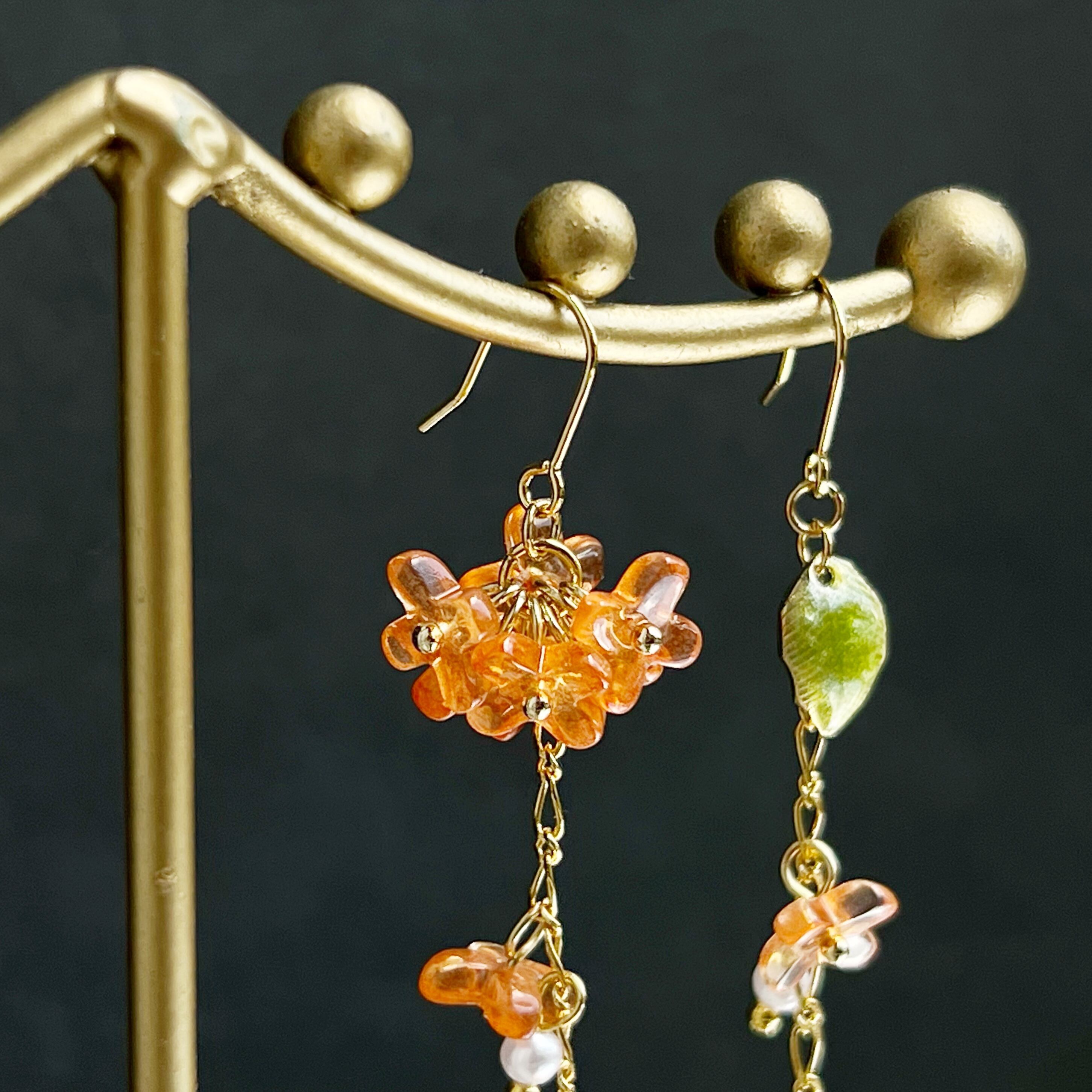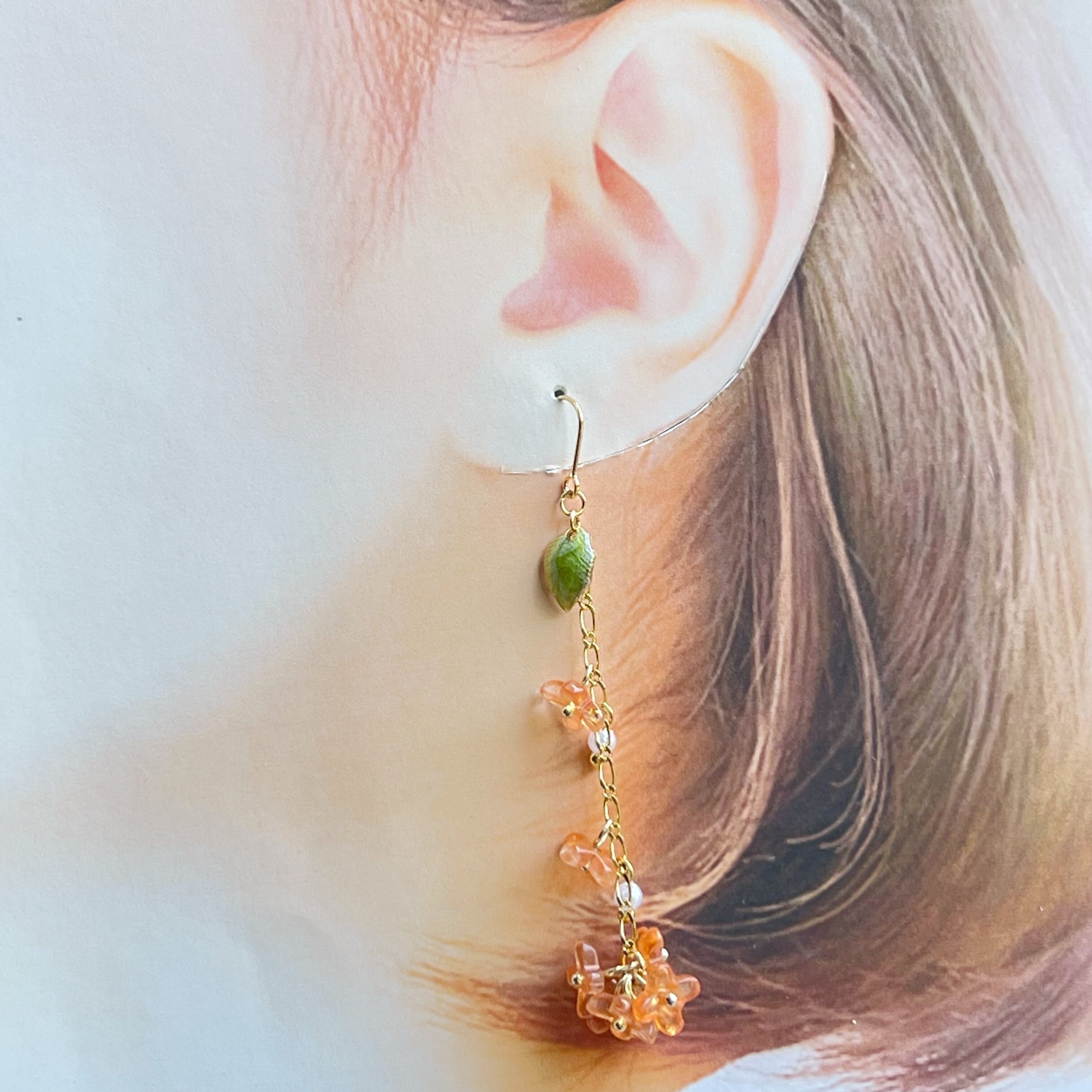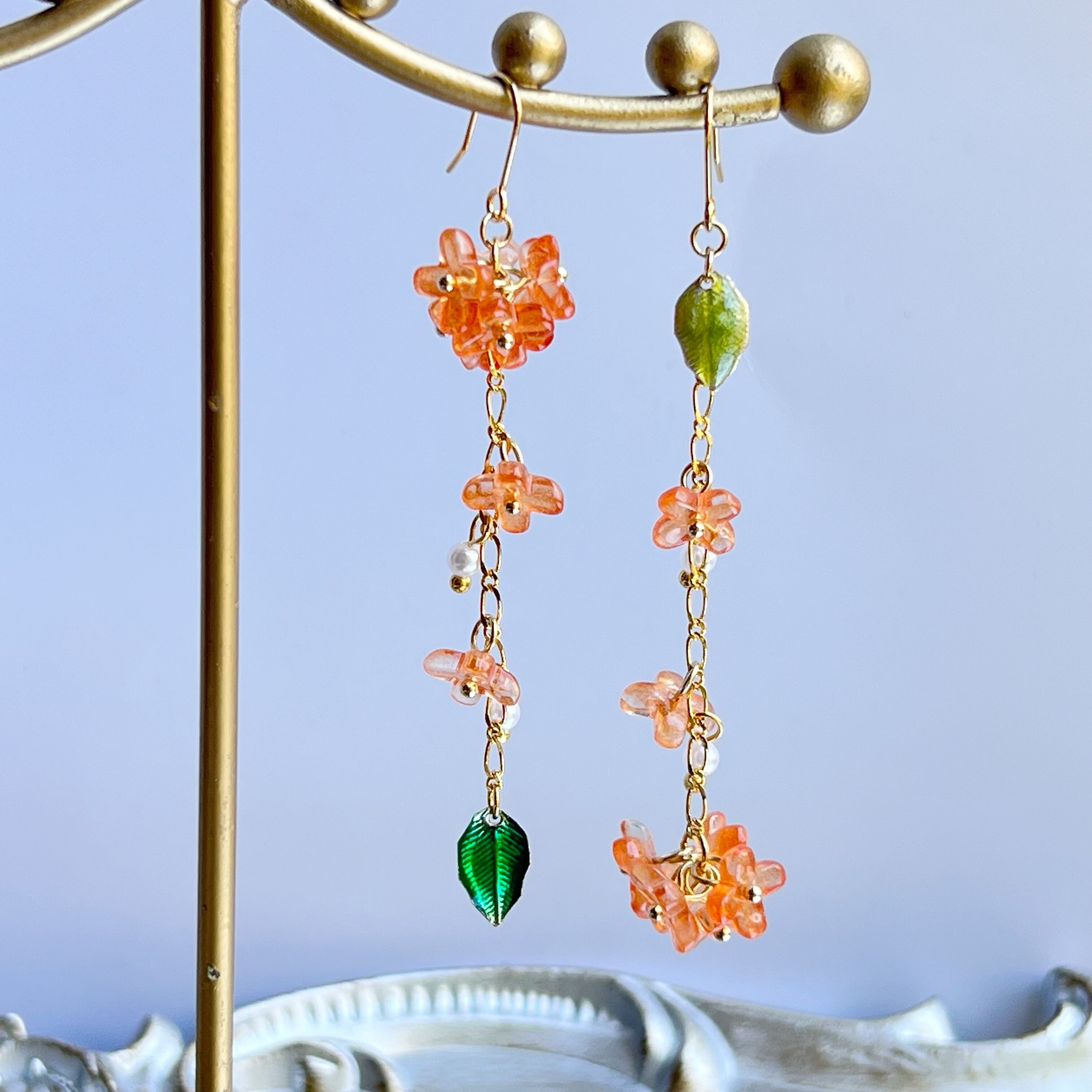 ガラスビーズでできたキンモクセイパーツ作った、ロングタイプのアクセサリーです。