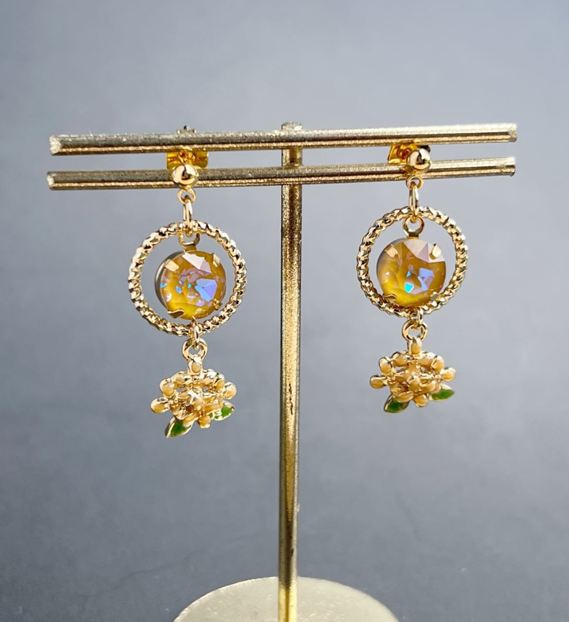 秋を楽しむ 金木犀と大粒ガラスストーンのピアス イヤリング キンモクセイ