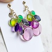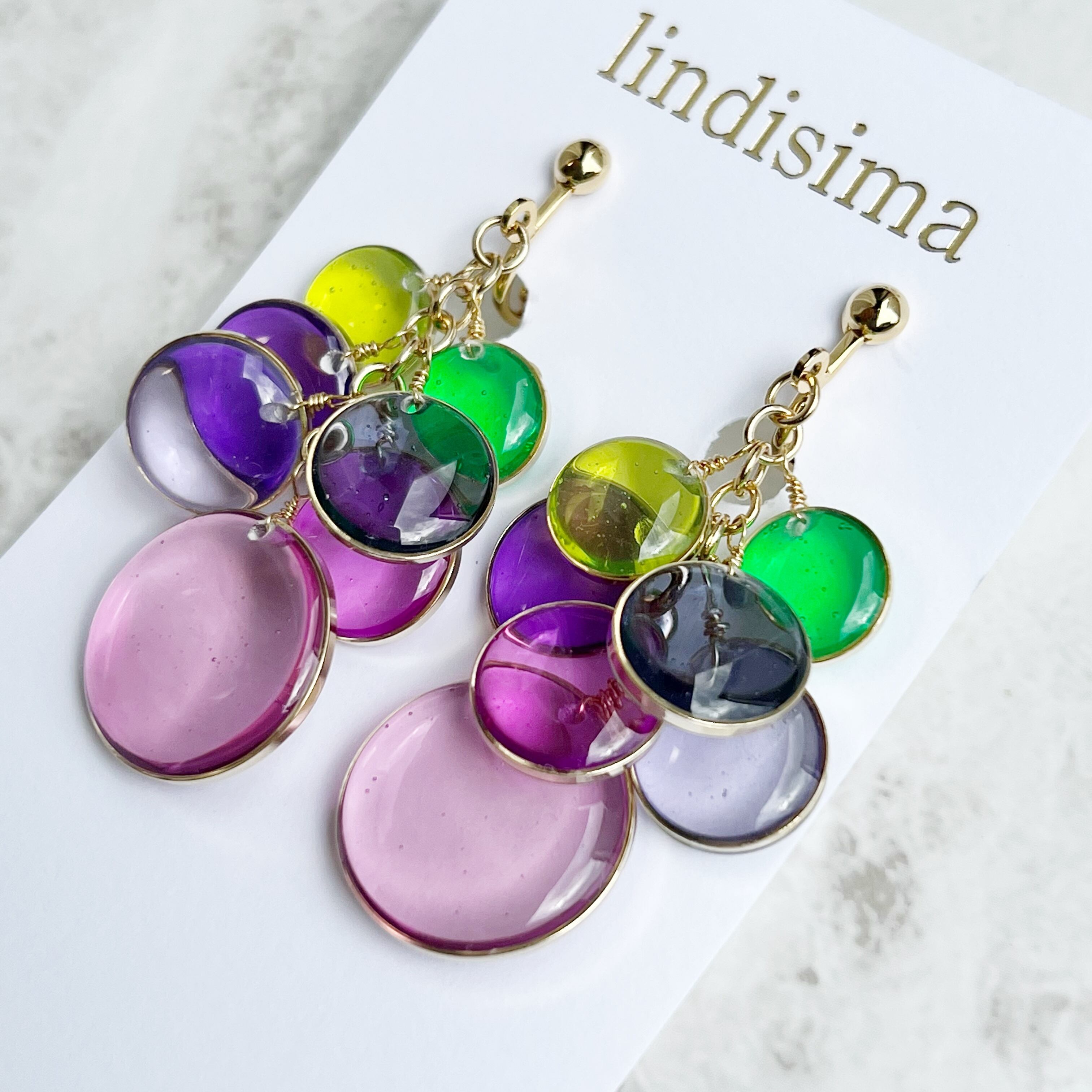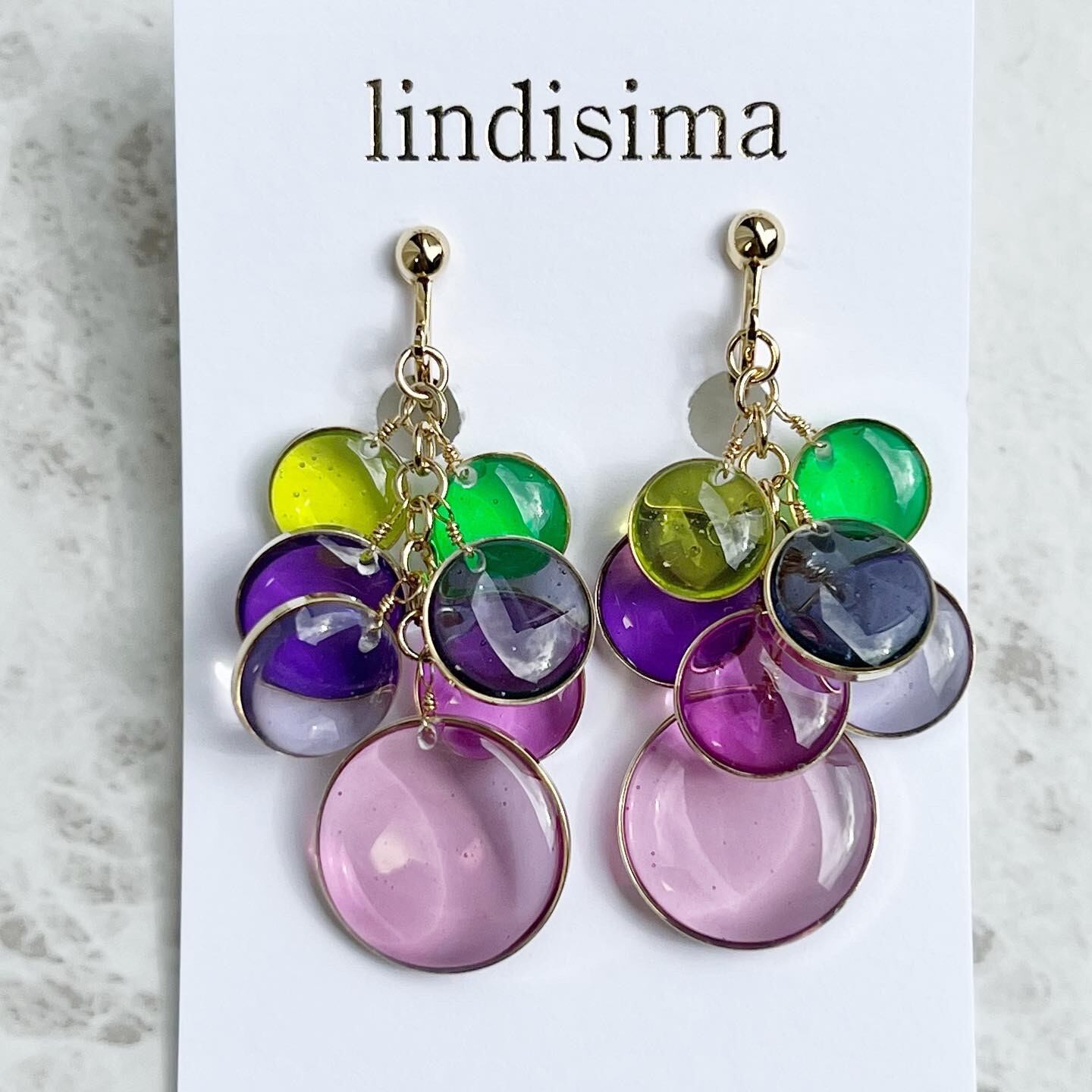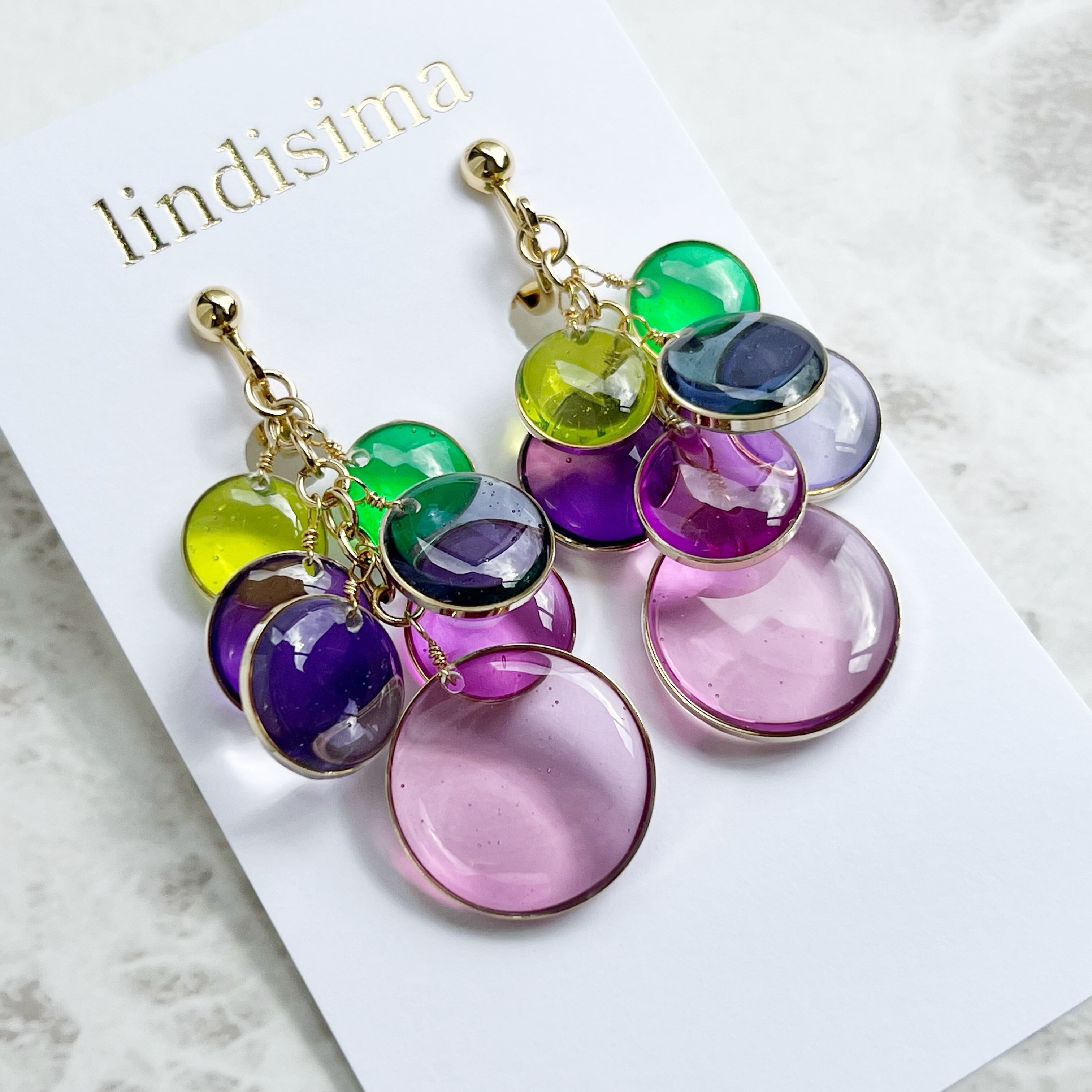 レジンでひとつひとつ丸い枠に、ぶどうをイメージした7色に着色し、イヤーアクセサリーに仕上げました。