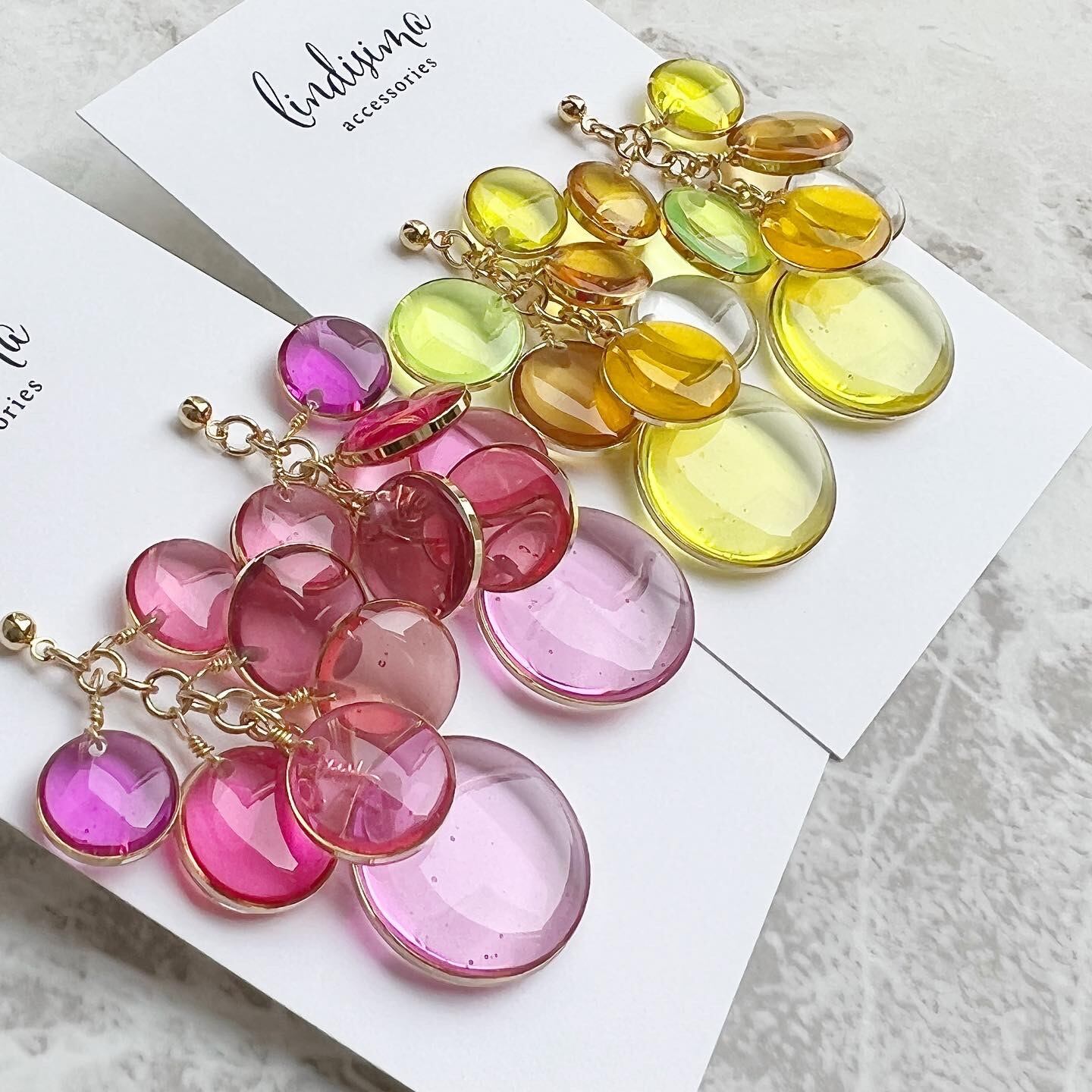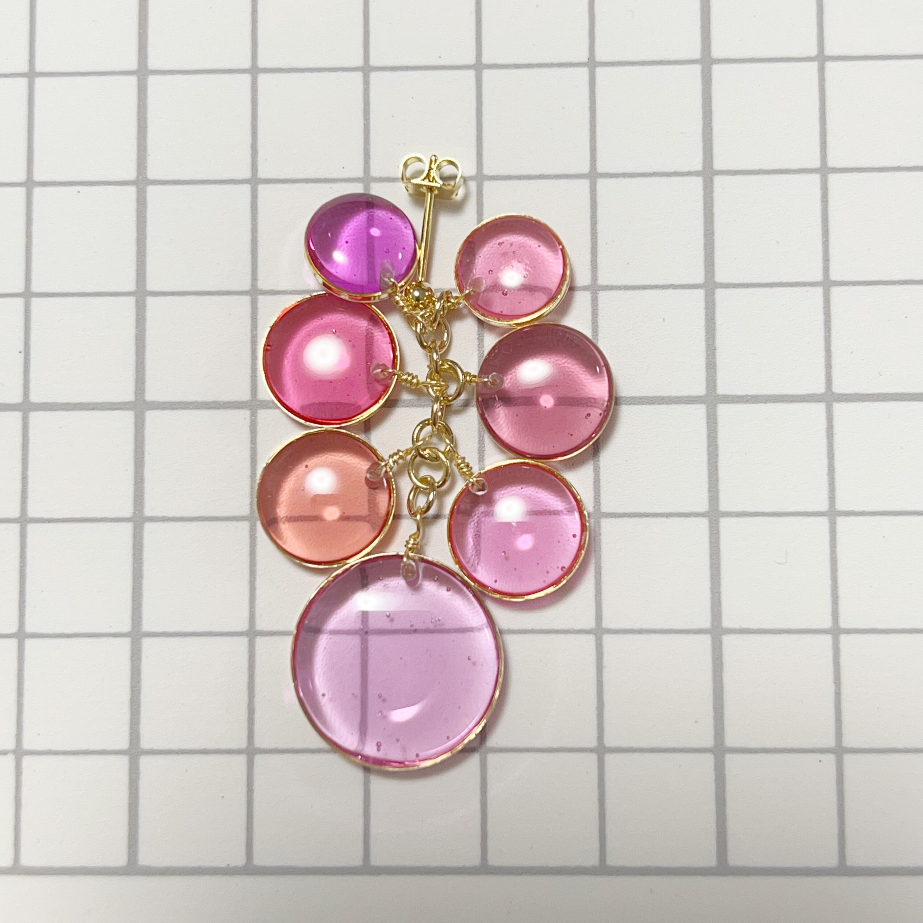 レジンでひとつひとつ丸い枠にピンクベースの7色着色し、イヤーアクセサリーに仕上げました。