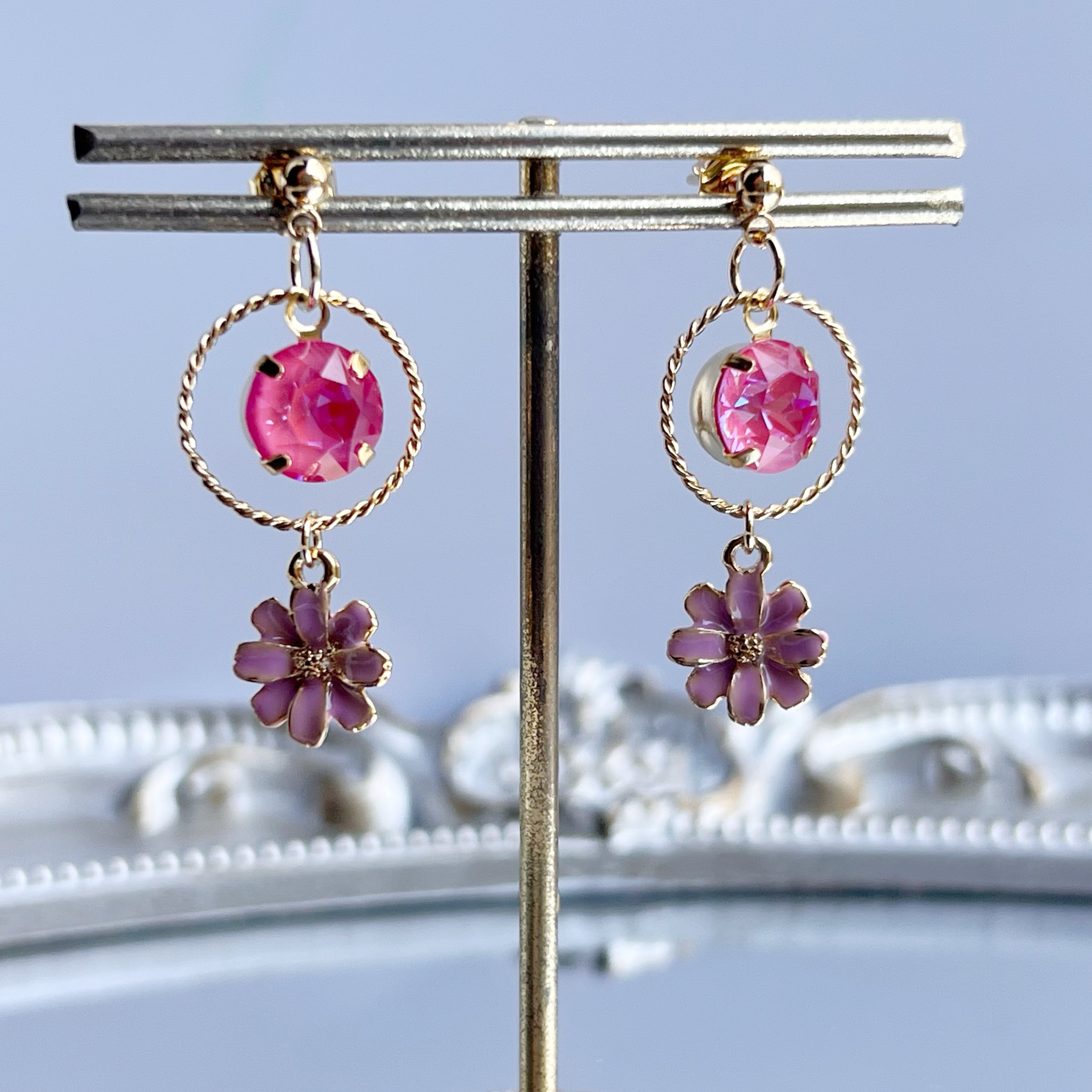 大粒のスワロフスキーと、かわいいコスモスのチャームを組み合わせた耳飾りです✨