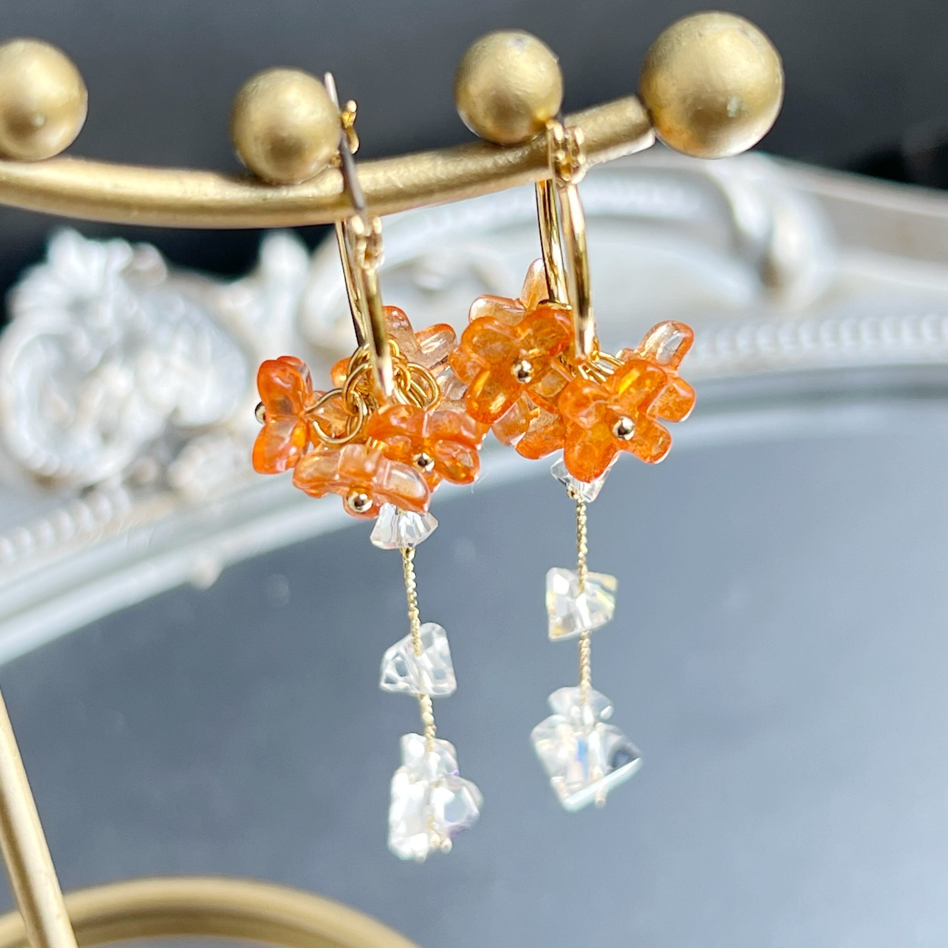 ガラスビーズでできたキンモクセイパーツ作った、フープタイプのイヤーアクセサリーとネックレスのセットです。