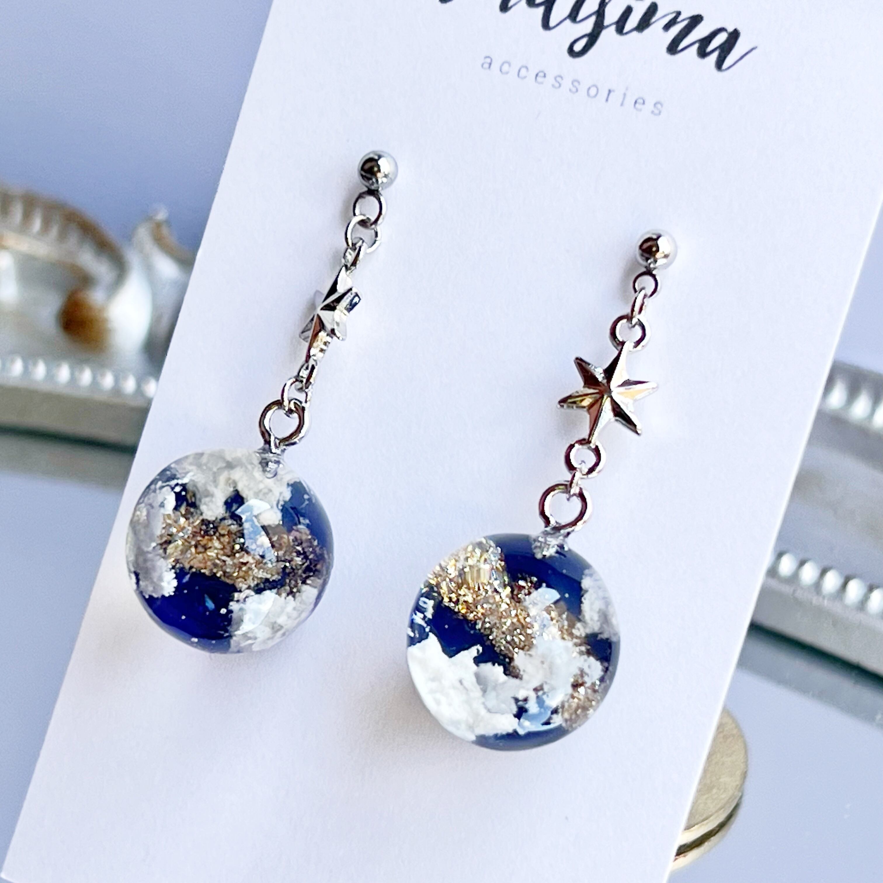 夜空をひとすくい 雲レジンの球体ピアス イヤリング