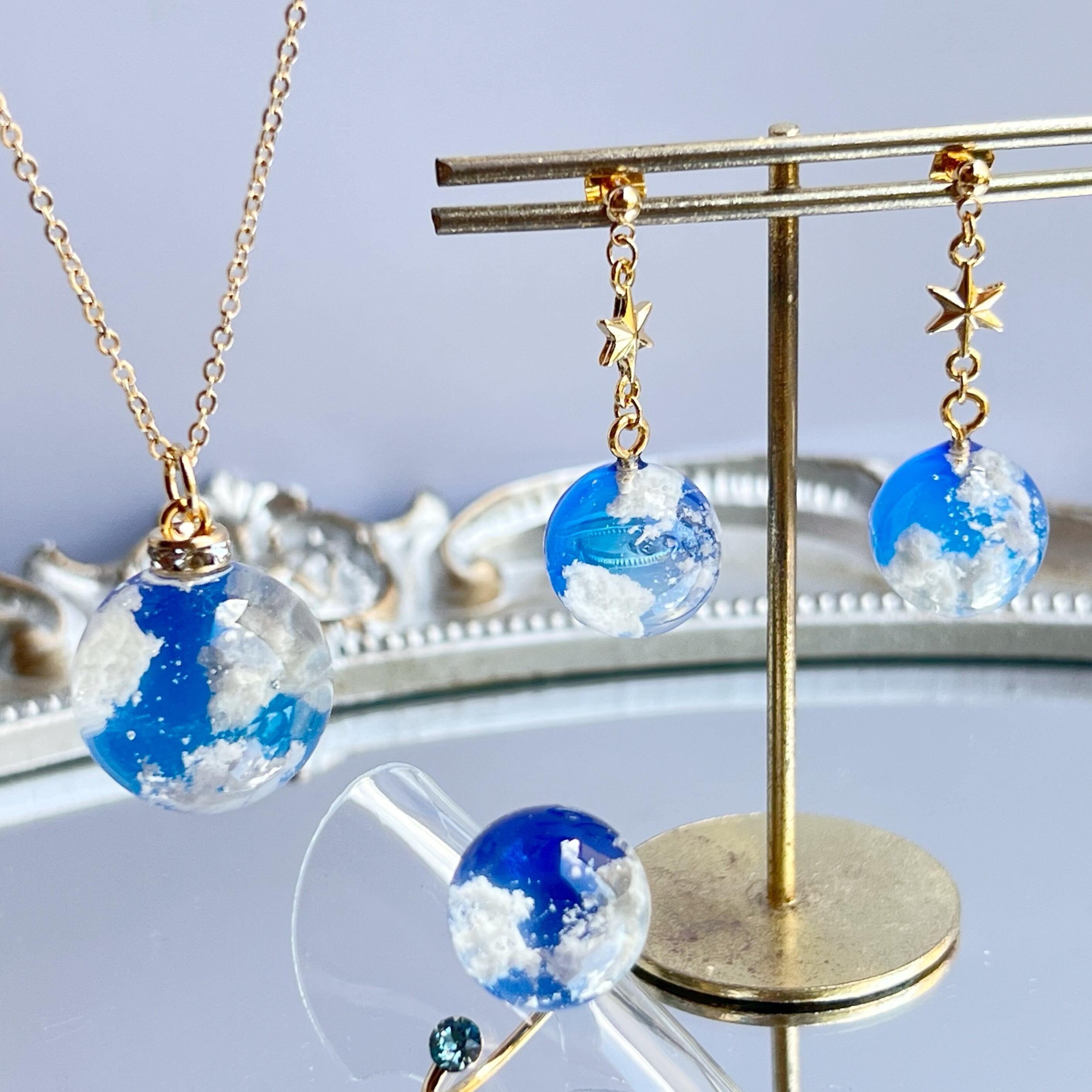 青空を閉じ込めたような、レジンで作った空玉アクセサリーのセット販売です。(ピアスorイヤリング、ネックレスorキーホルダー、リング)