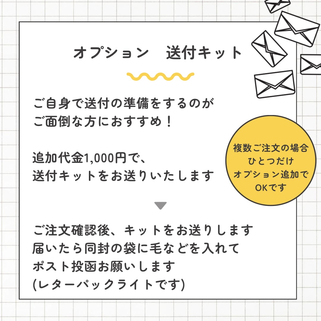+1,000円で、ご注文後こちらから送付キットをお送りすることも可能です。お客様の方でキットが届きましたら封入されたいものを同封の袋に入れていただき、ポスト投函をお願いします。レターパックライトの封筒をお送りします。(キットの送付はこちらからクリックポストで手配します)