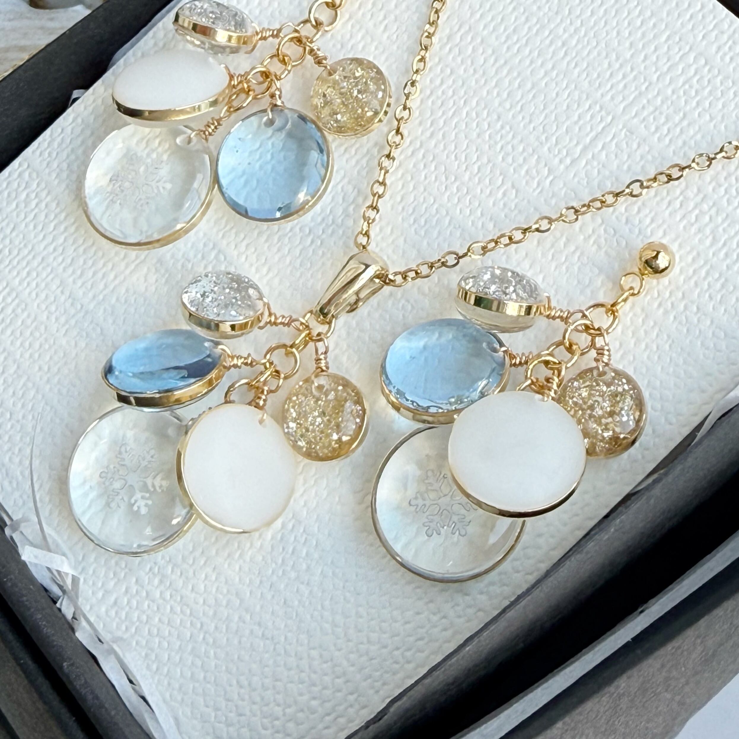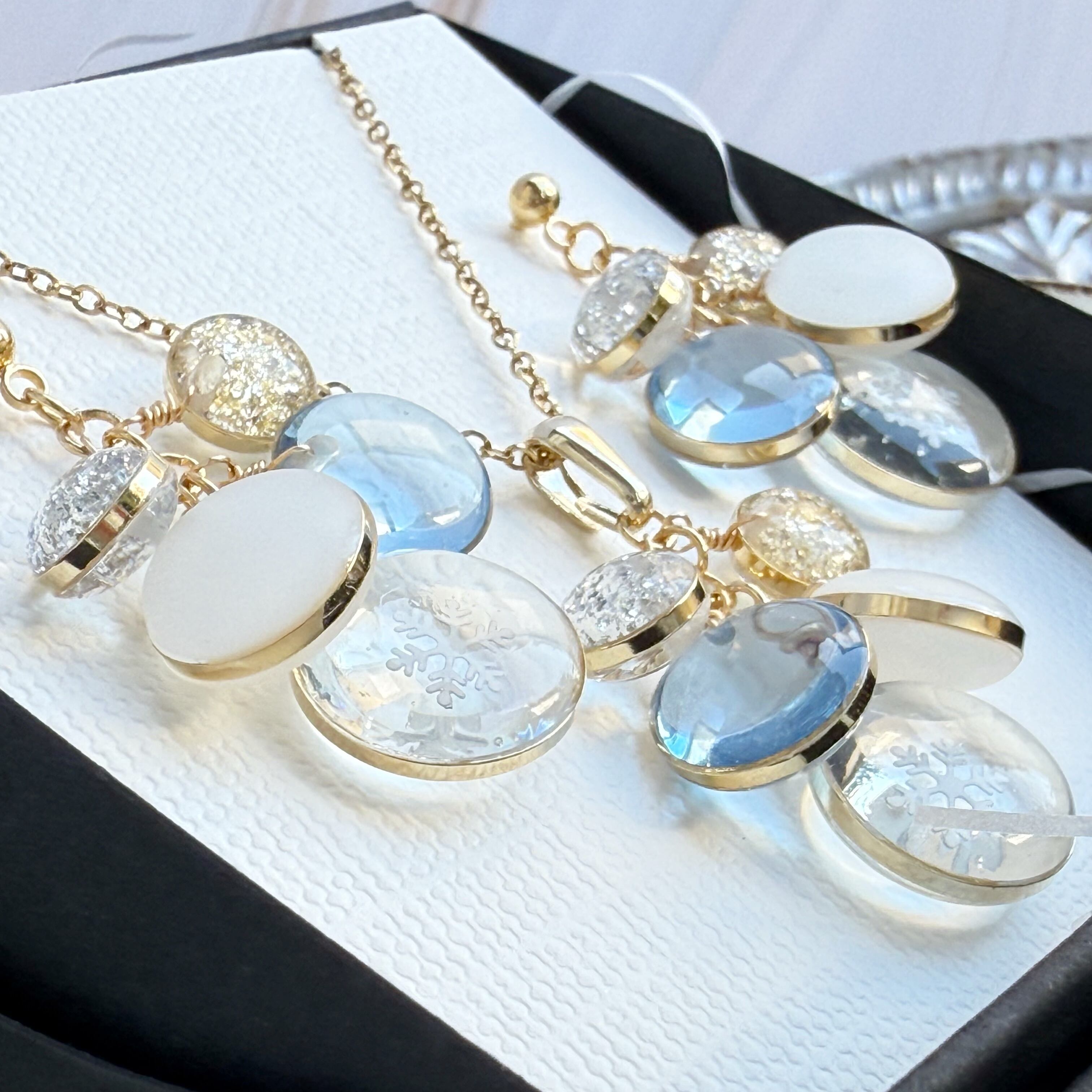 レジンで一つ一つ丸い枠に着色し、シャラシャラと可憐に揺れるアクセサリーに仕上げました。