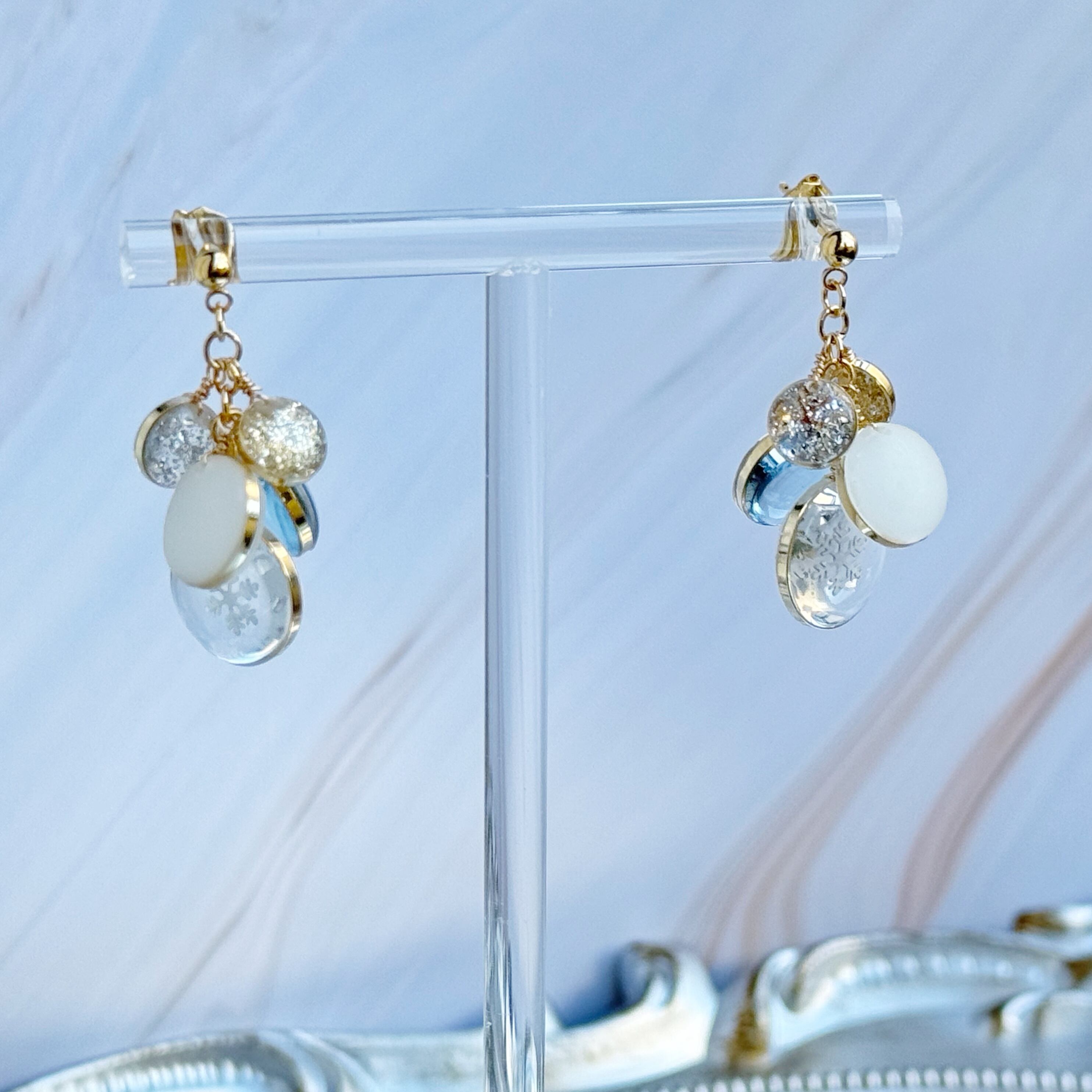 レジンでひとつひとつ丸い枠に青系の色に着色し、イヤーアクセサリーに仕上げました。