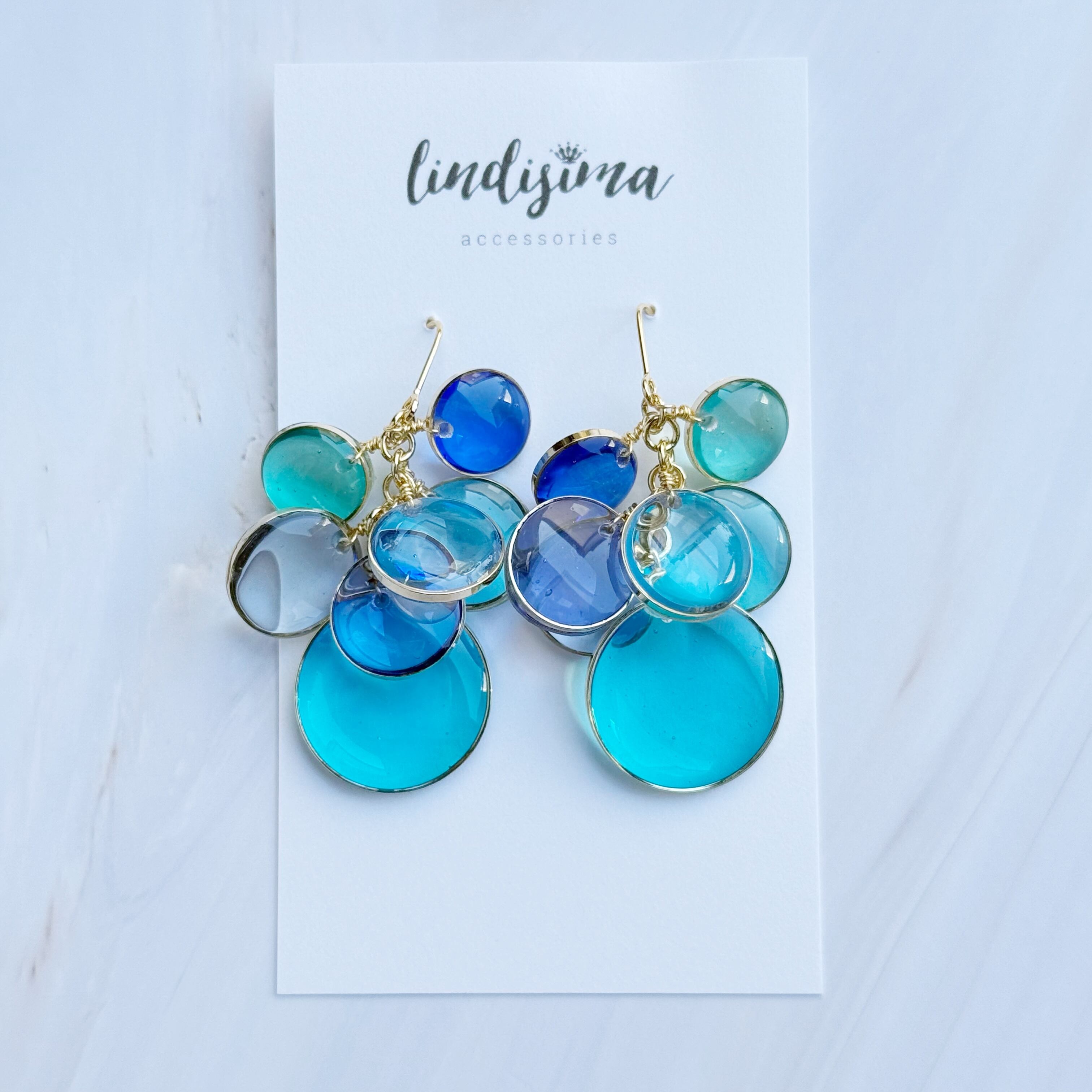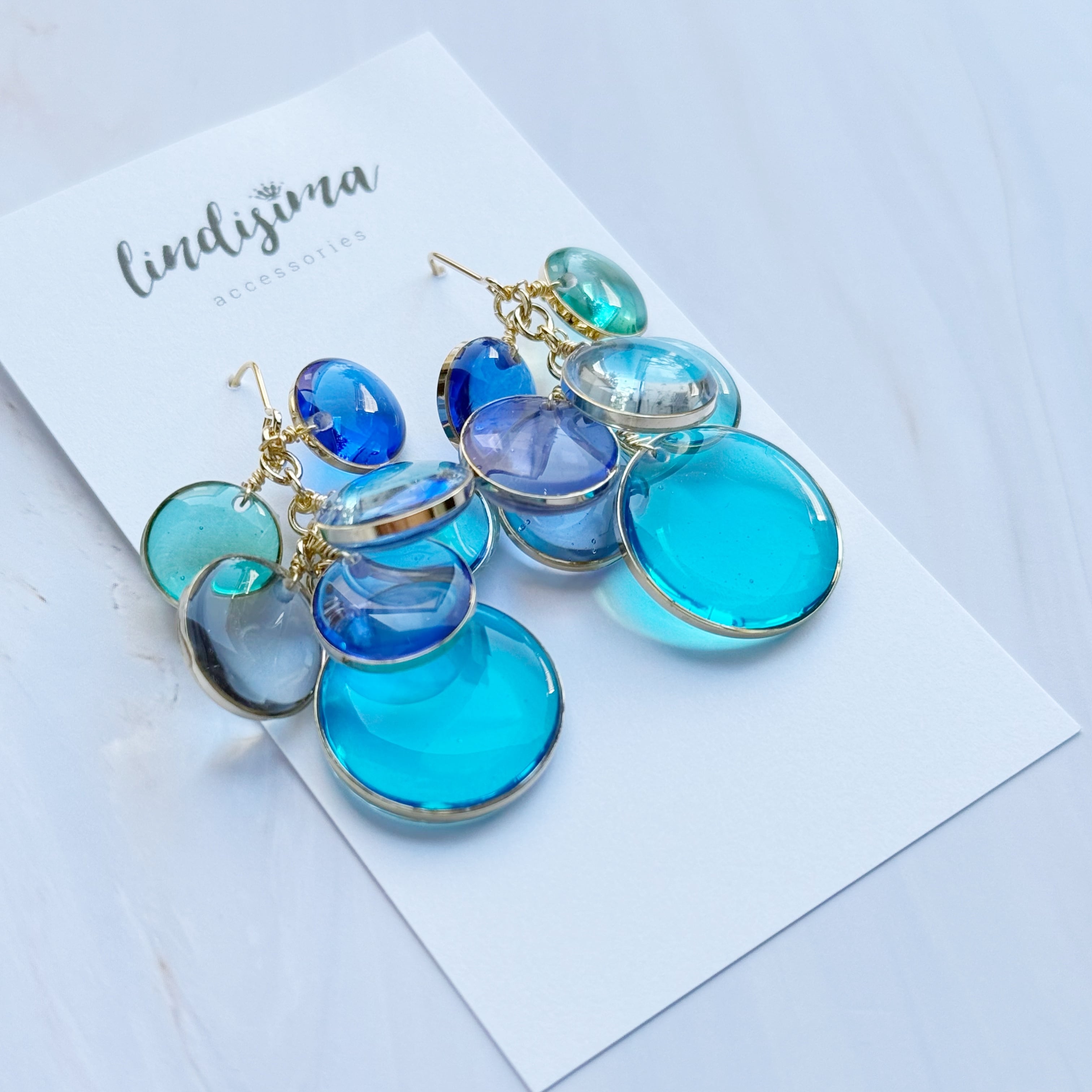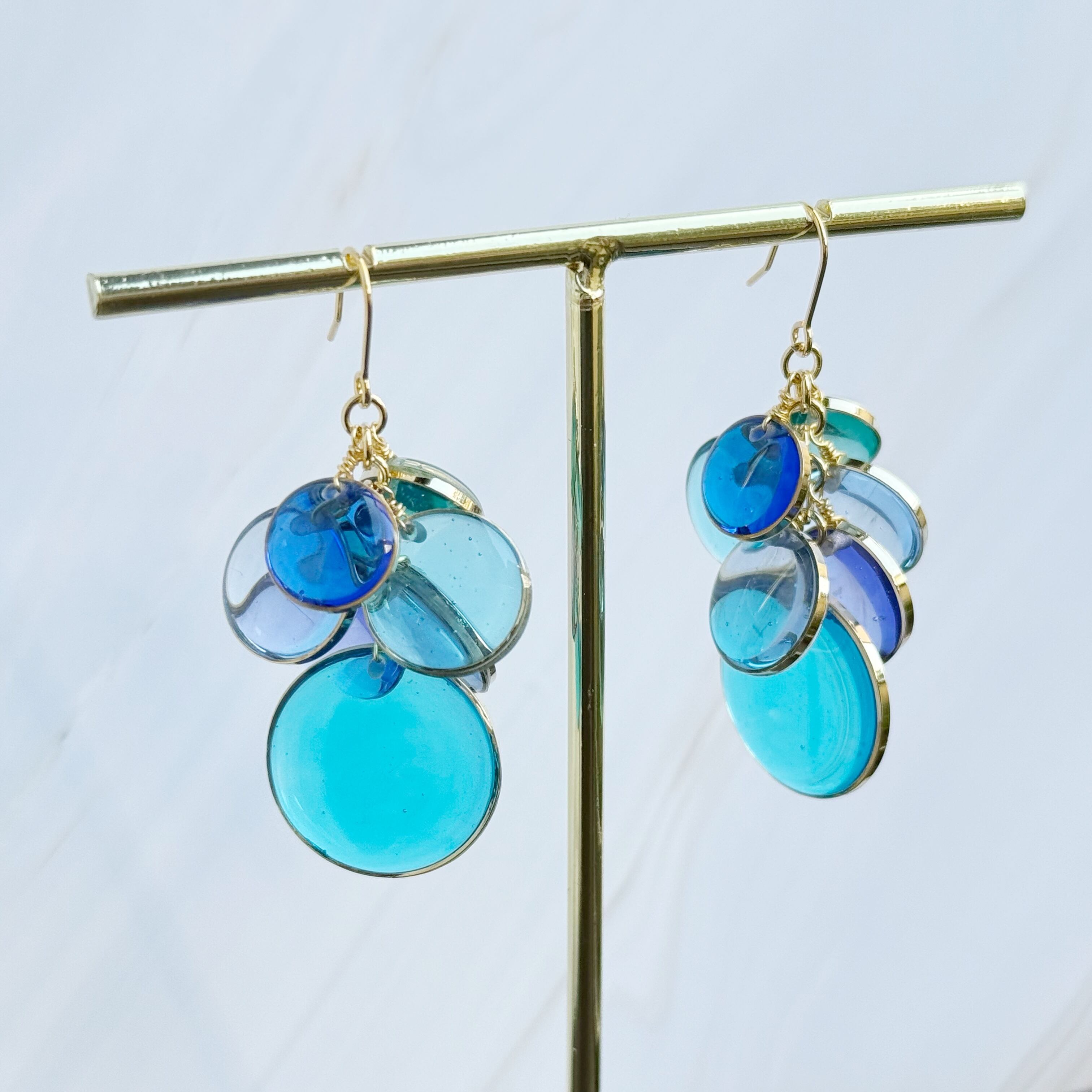 レジンでひとつひとつ丸い枠に青系の色に着色し、イヤーアクセサリーに仕上げました。