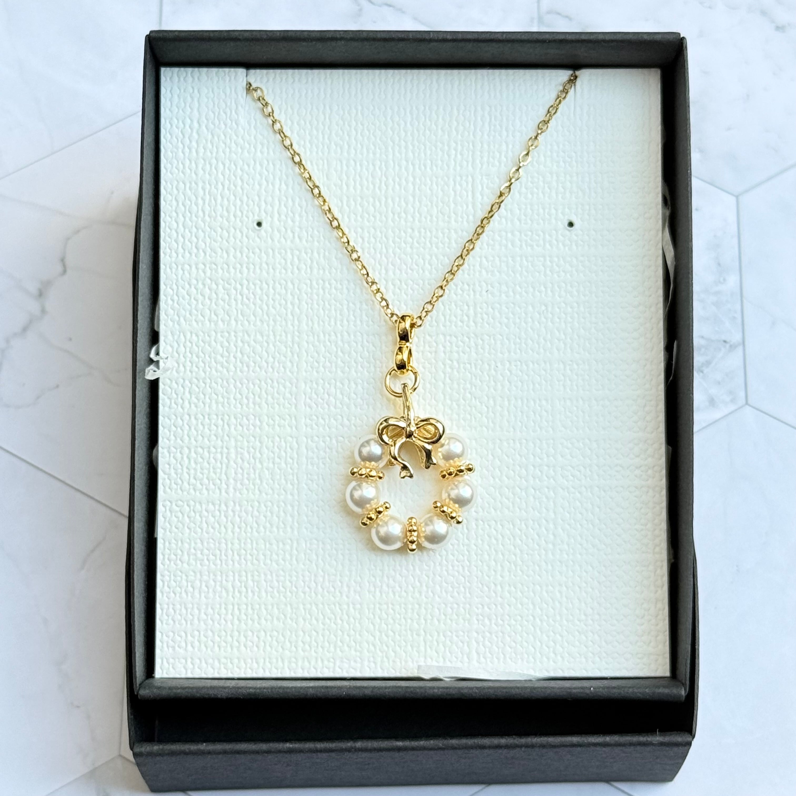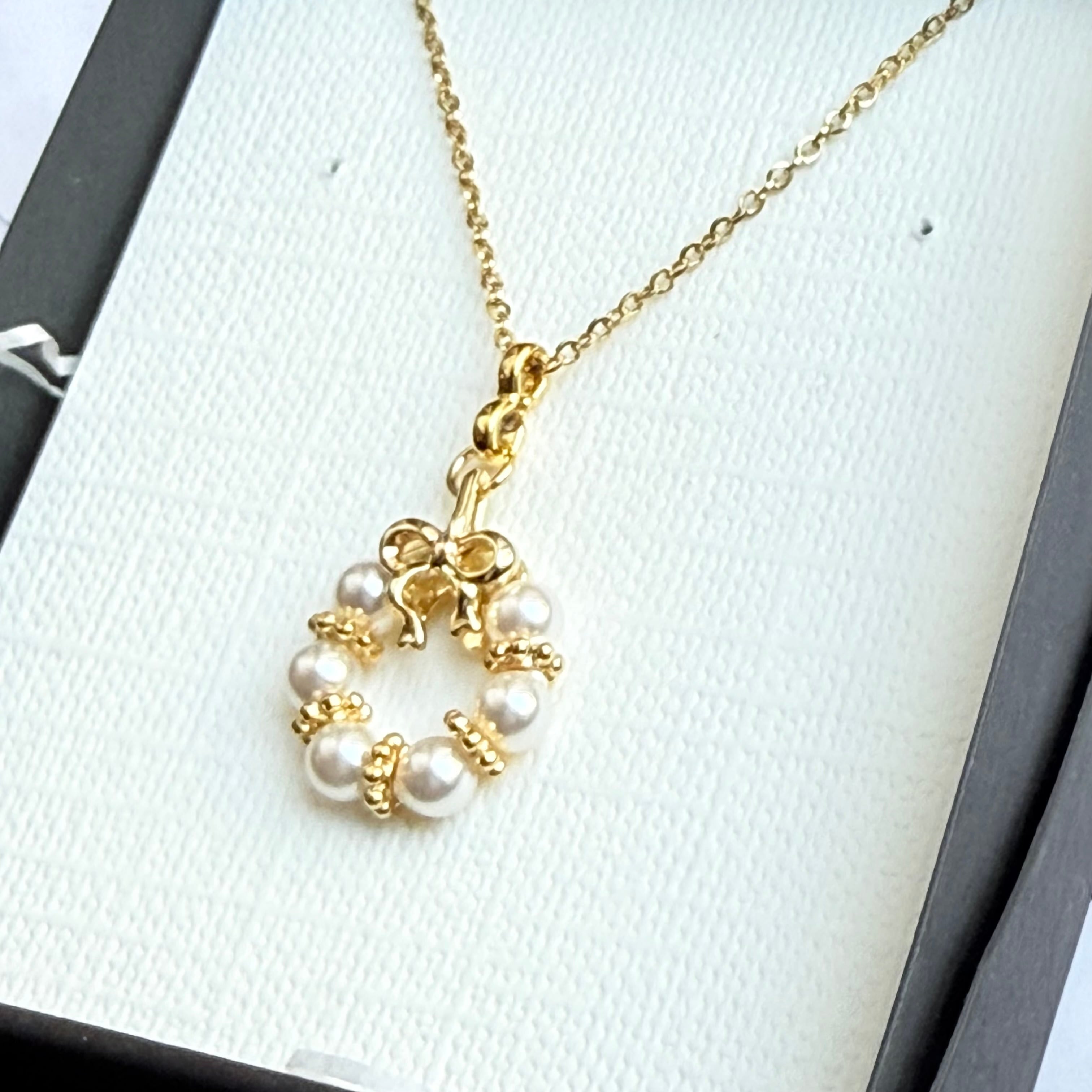クリスタルパールの小さなクリスマスリースネックレス サージカルステンレス つけっぱなしOK