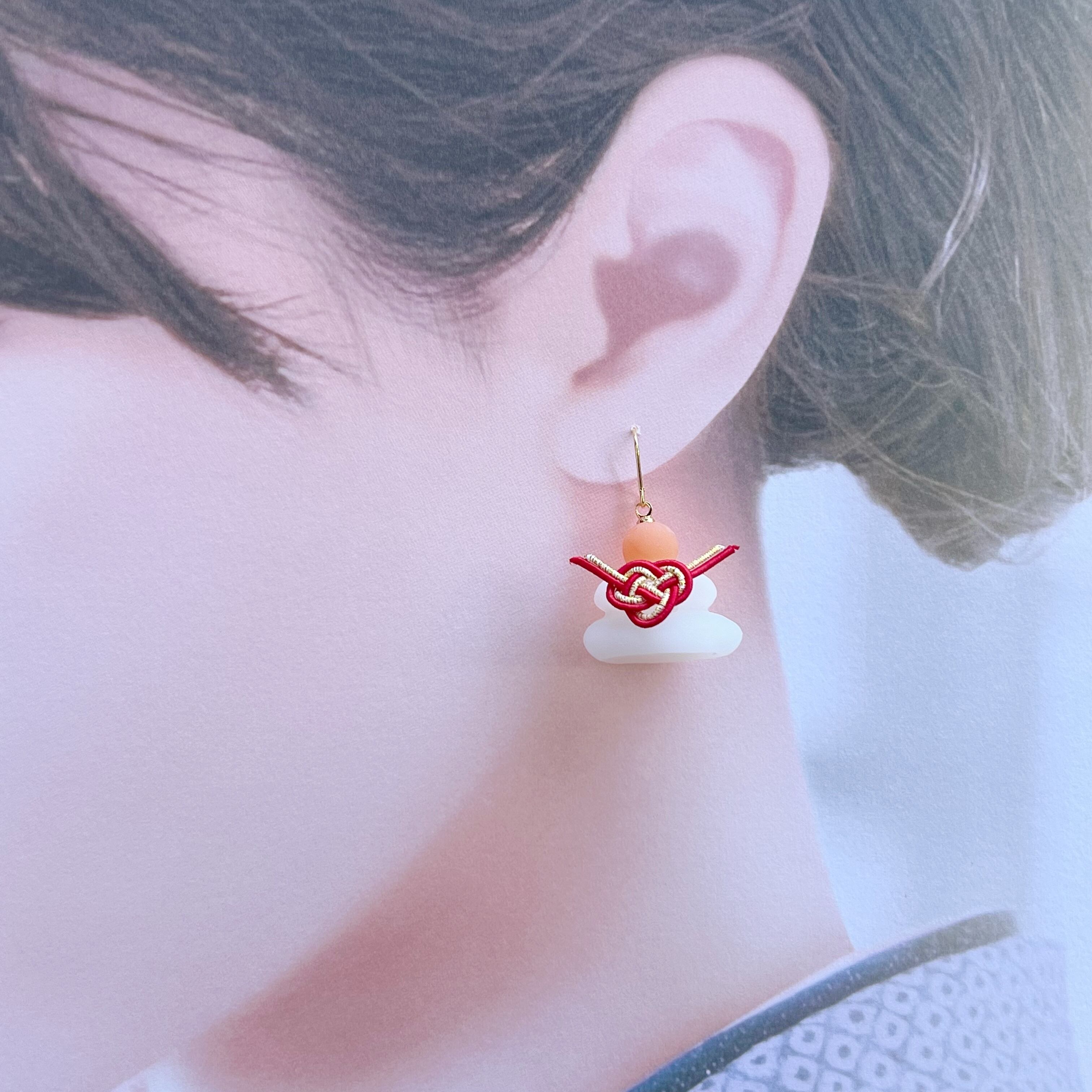 お正月にぴったり!小さなミニチュア鏡餅ピアス イヤリング かがみもち 和装アクセサリー