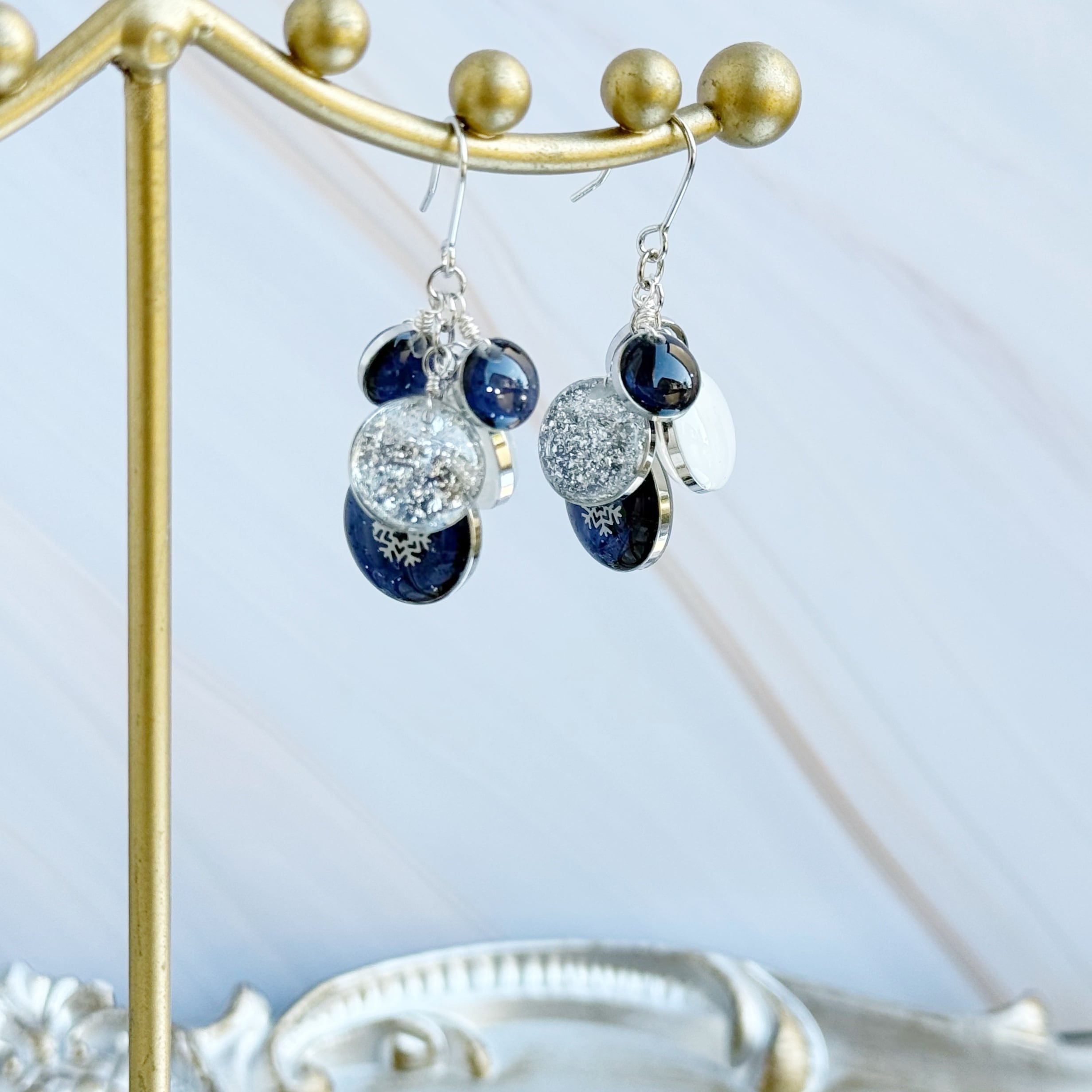 レジンでひとつひとつ丸い枠に青系の色に着色し、イヤーアクセサリーに仕上げました。