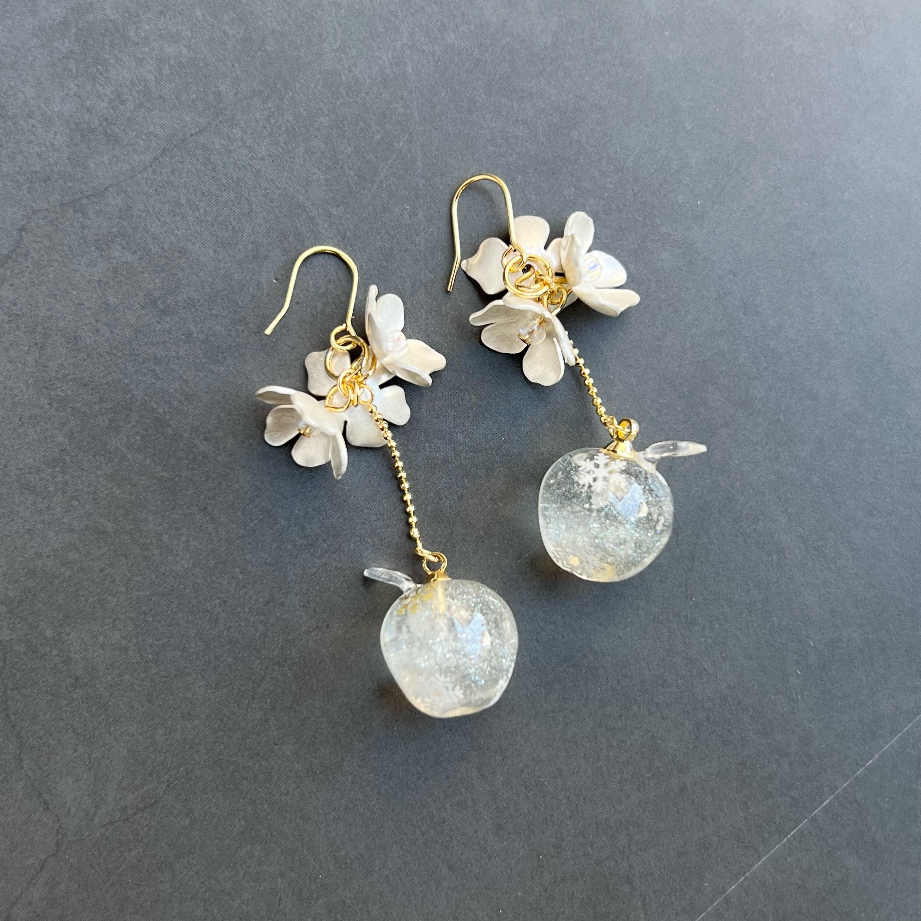 レジンで作った雪の結晶パーツの入った小さなリンゴと、リンゴの花に見立てたフラワーパーツを組み合わせたイヤーアクセサリーです。