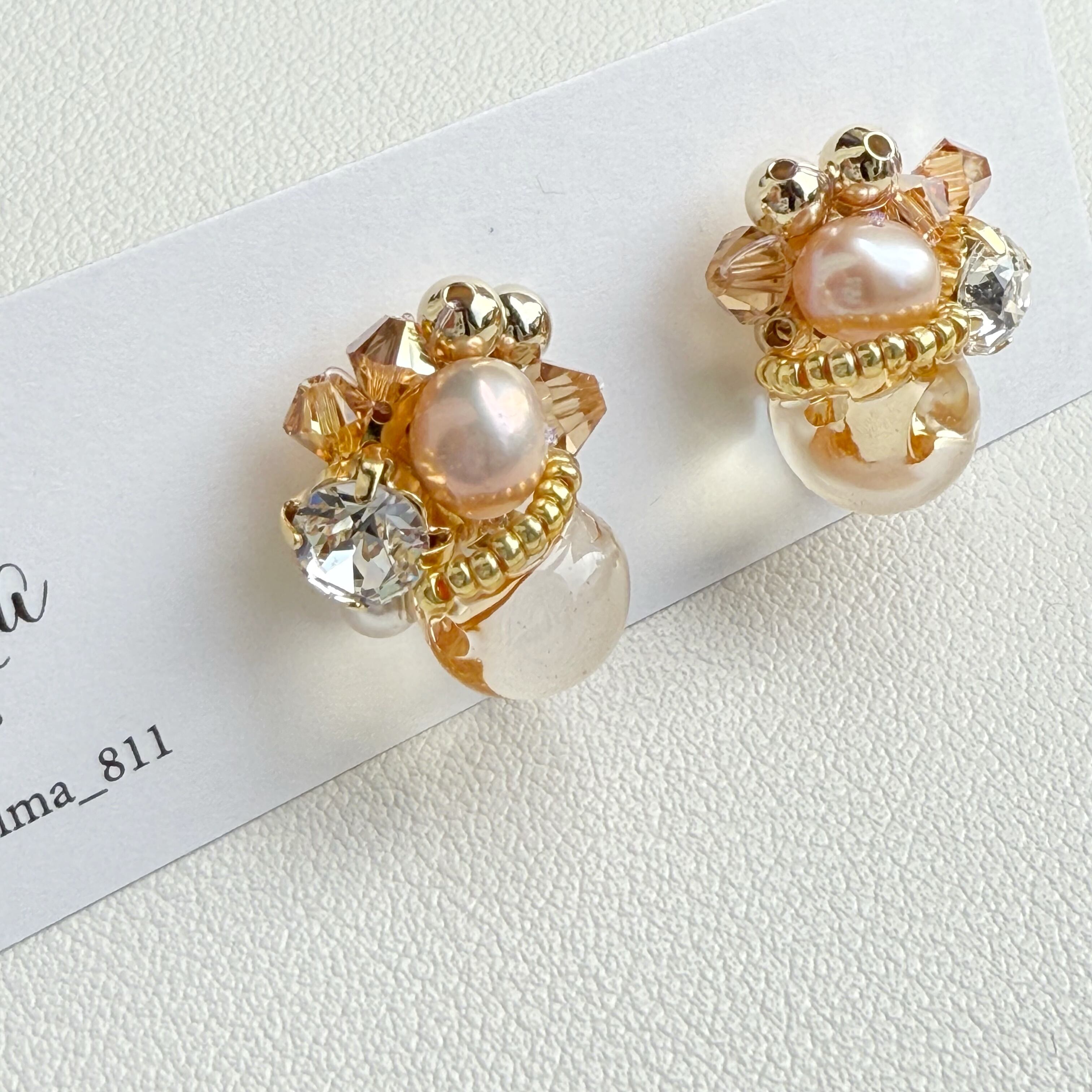 テグスで一つ一つビーズやクリスタルガラスを編み込んで丁寧にお作りした、イヤーアクセサリーです。