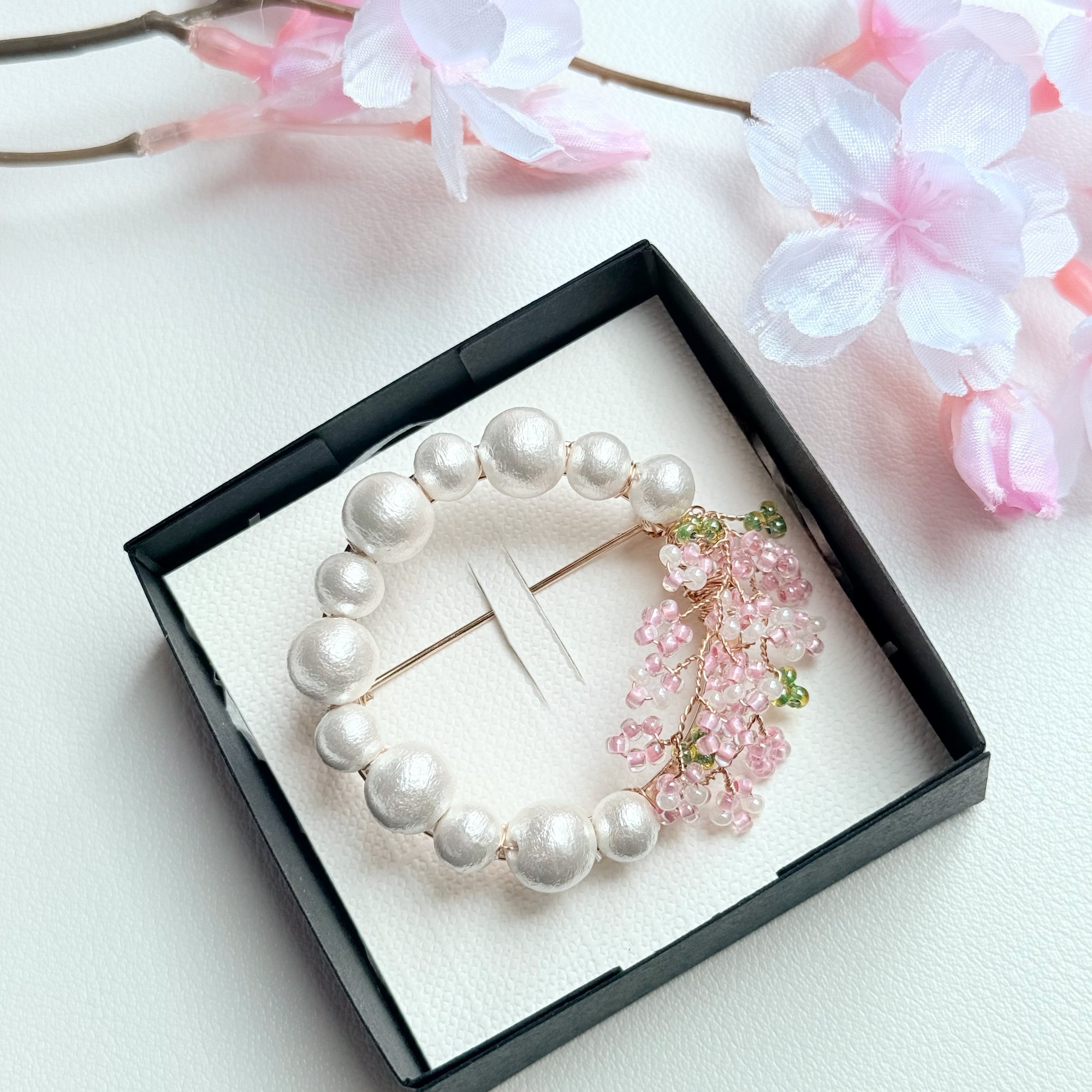 春爛漫 枝垂れ桜とコットンパールのブローチ